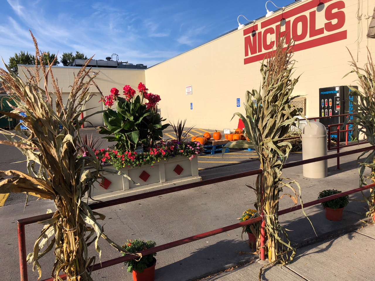 Seen outside my favorite supermarket before my stop for that bring-to-work coffee Monday morning was a busy worker adding to the seasonal display.