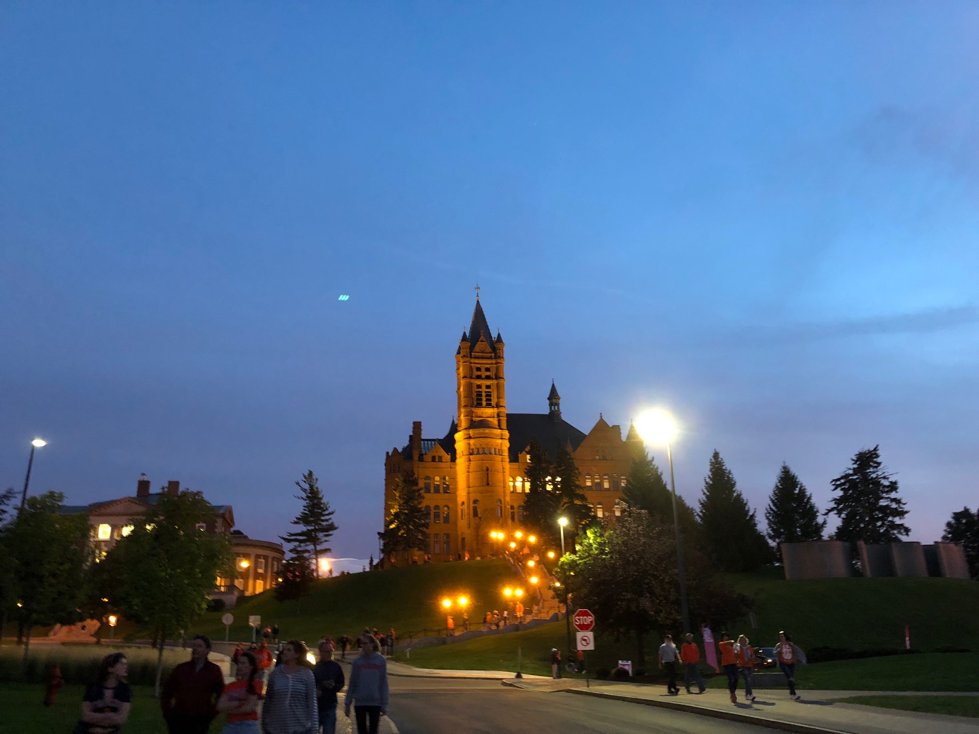 In early autumn, the departure time from the contest gave my dear wife Karen and I a lovely view of a certain glow around and coming from Crouse College.