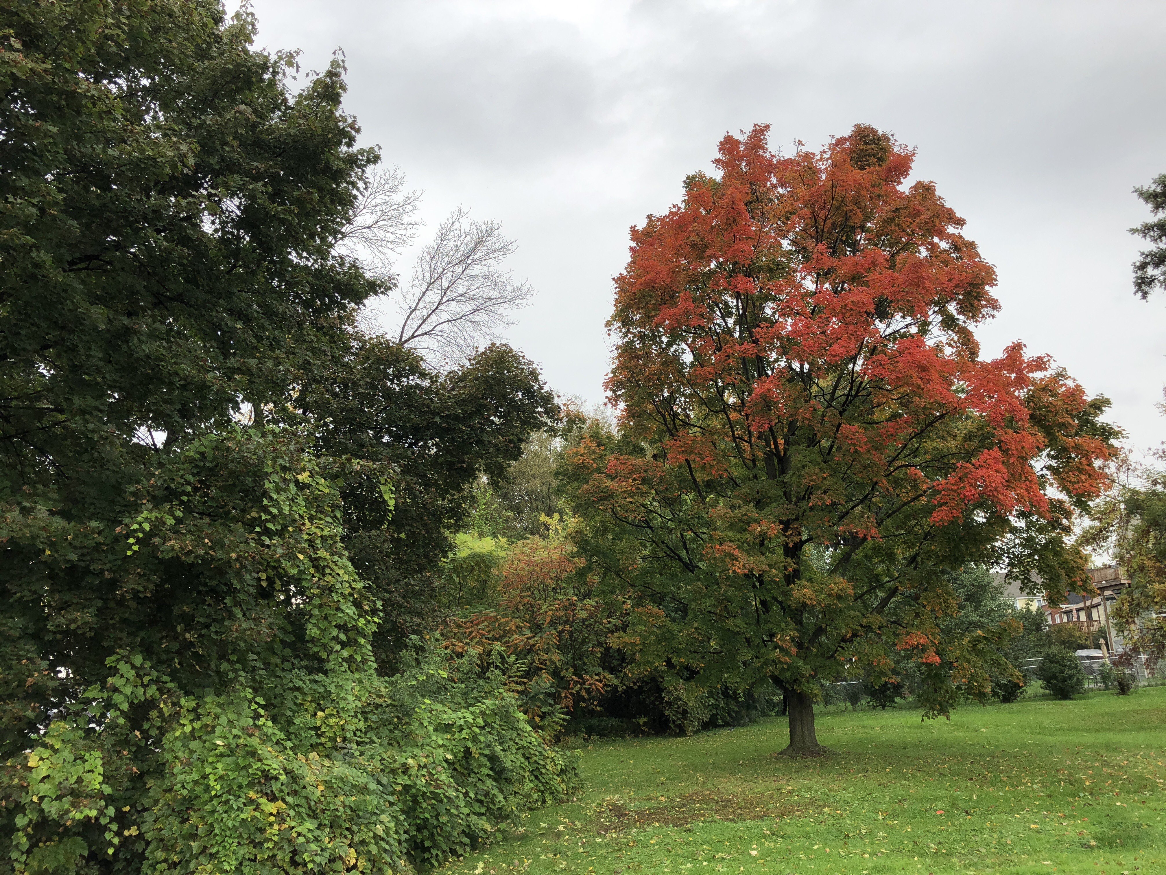 My work colleagues and I saw for the first time during our Thursday afternoon break walk from the library, a tree around the path at Onondaga Lake Park that I would qualify as truly orange.