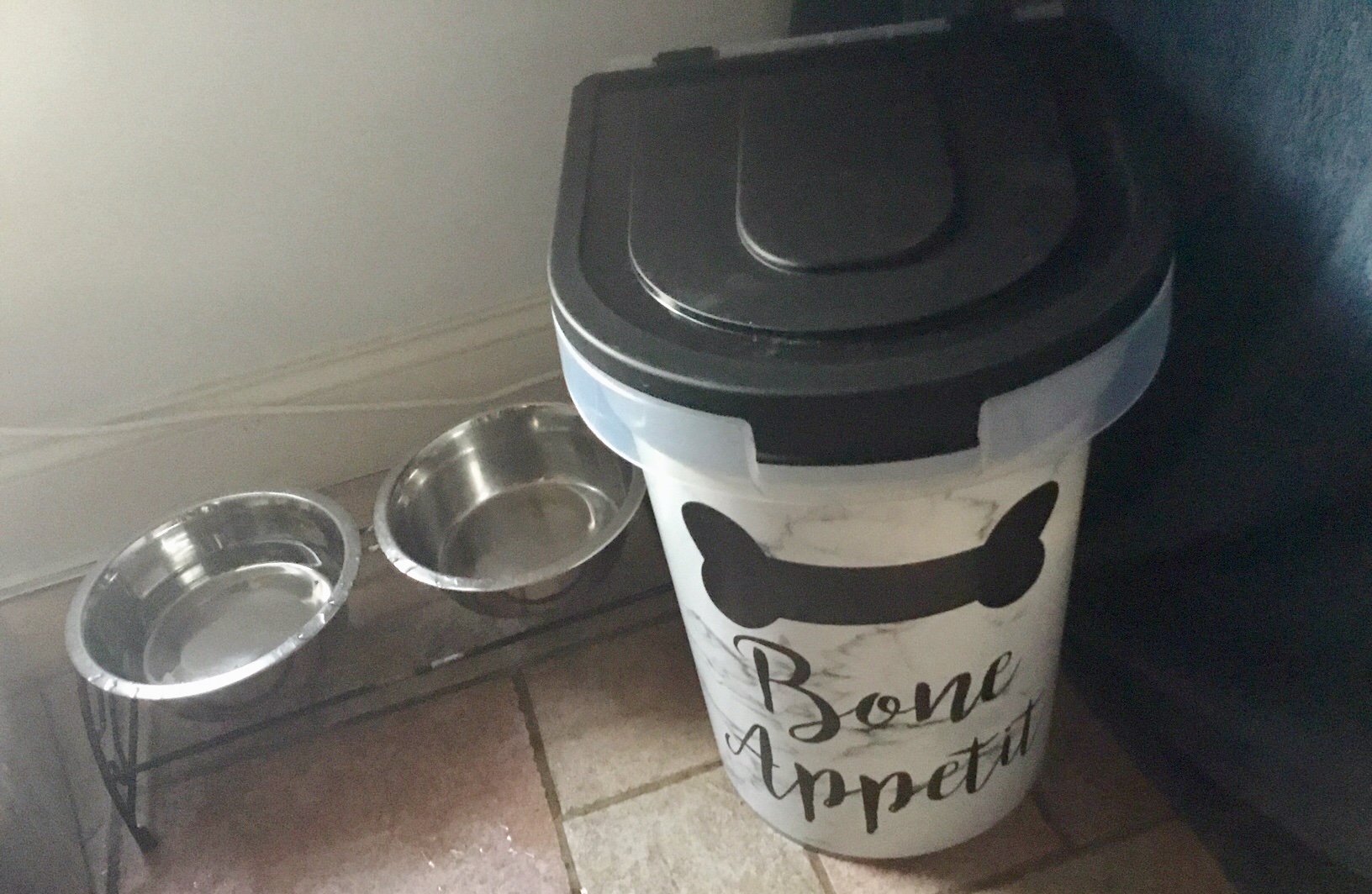 My dear wife Karen recently discovered a new bin to store the food that Ellie B aka Dogamous Pyle prefers for her twice-a-days.