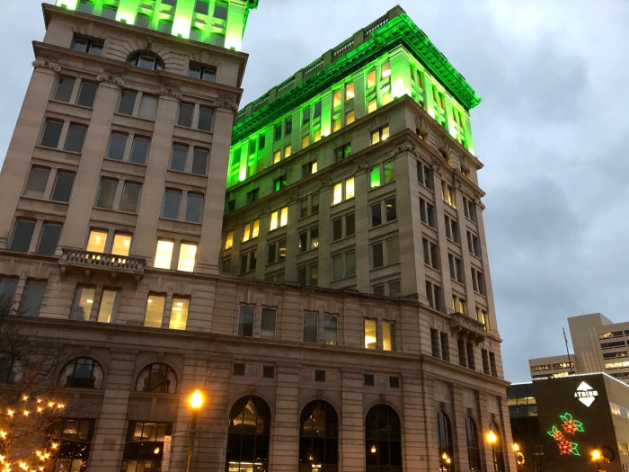 We have the old “Electric Building” – I forget what it’s called now. But in any event, for holidays they light up the top few floors – different colors for different holidays – and it makes quite an impact on the downtown area.