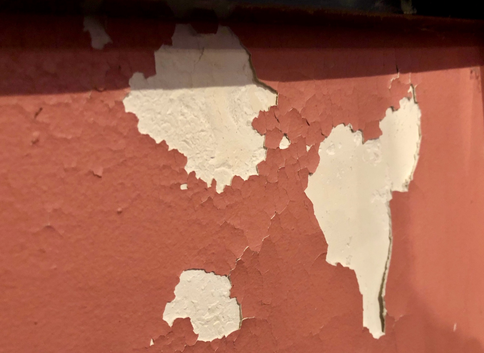 The faraway wall has paint peeling in a peculiar pattern. Or maybe somebody chipped it away on purpose.