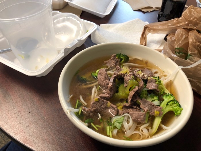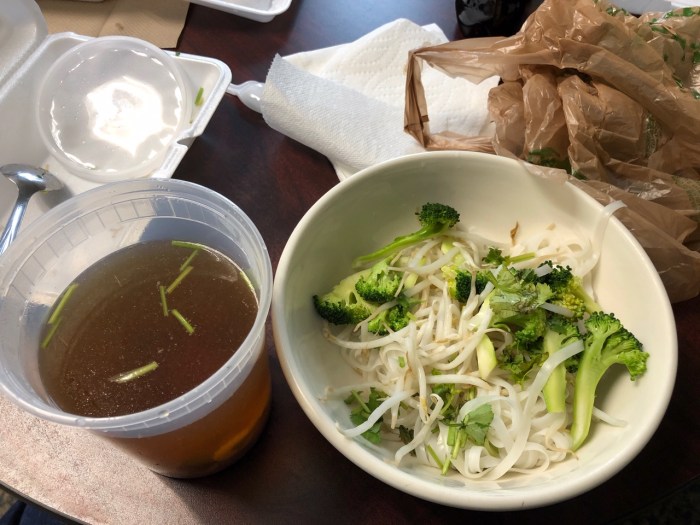 The broth and beef lives in one hot container. The noodles and veggies live in another.