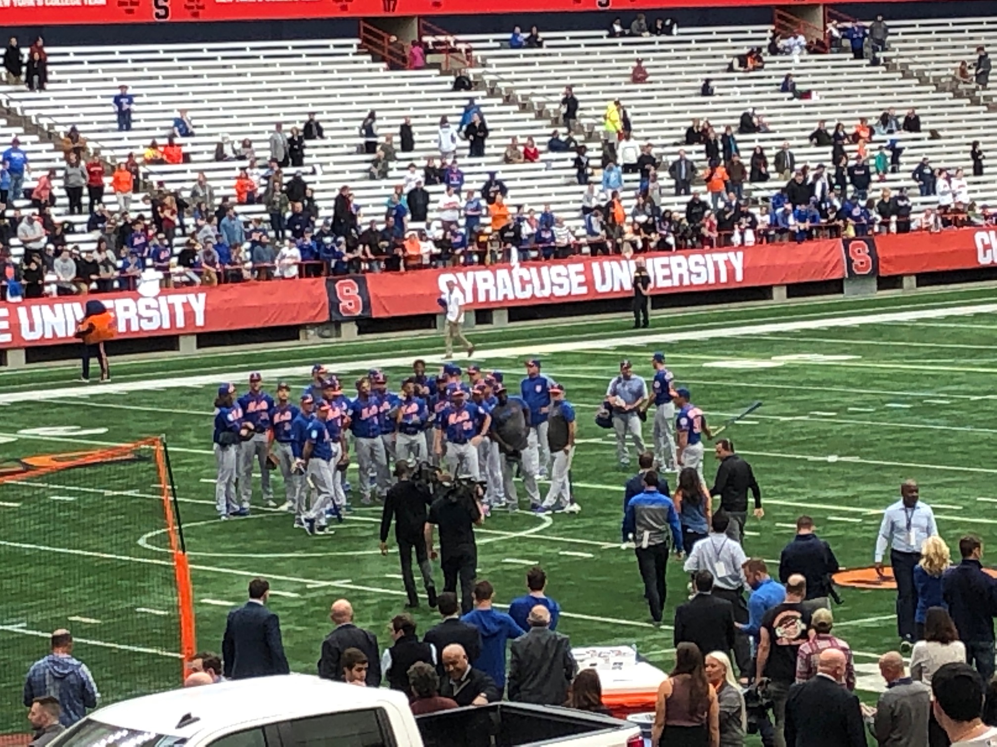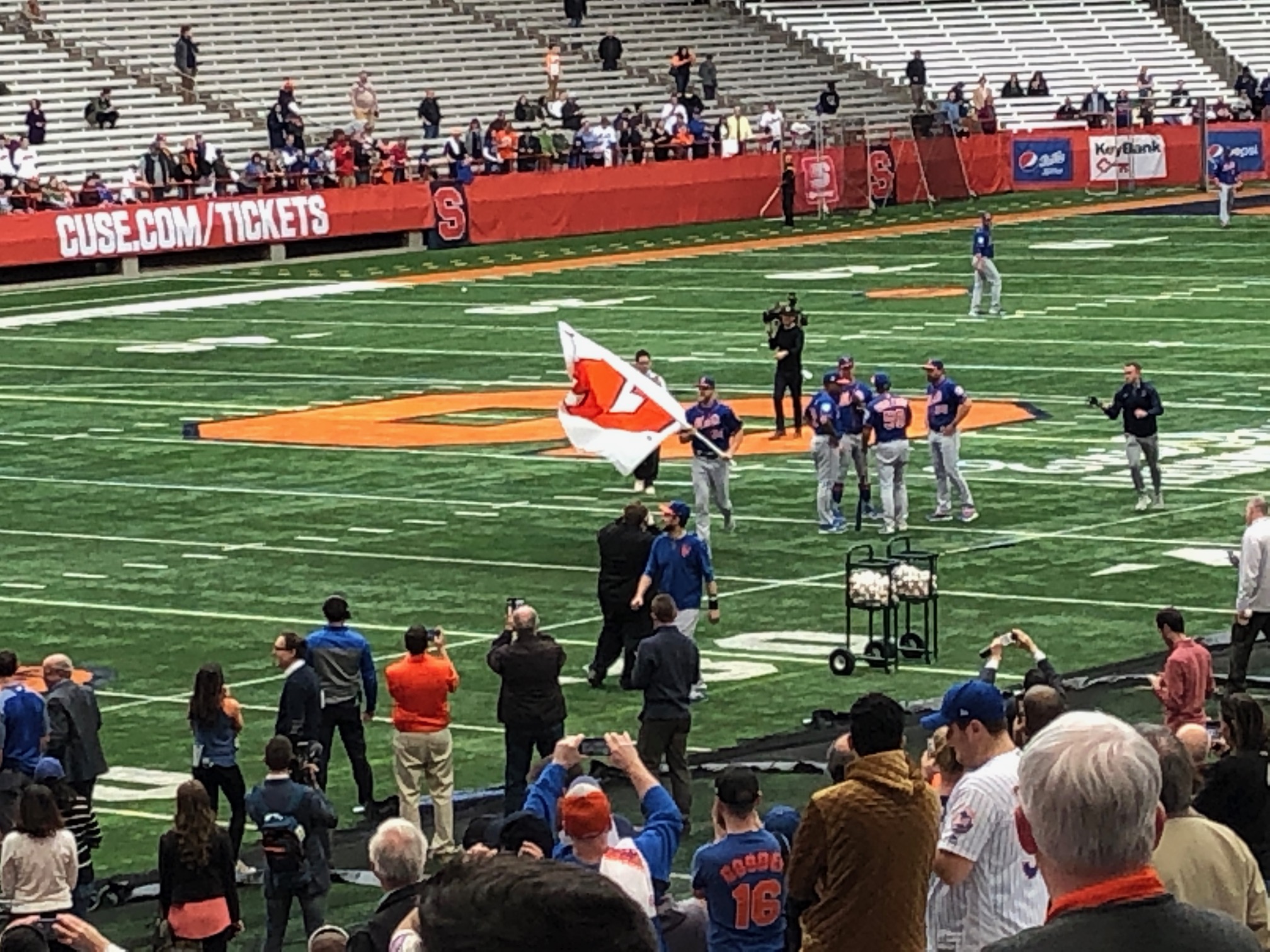 After his honest interview about wishing that the Mets did not have this trip to Syracuse on their agenda, pitcher Noah Syndergaard appeared to make amends by grabbing the Syracuse University cheer squad’s “S” flag, taller even than him, and walking and waving it around the field.