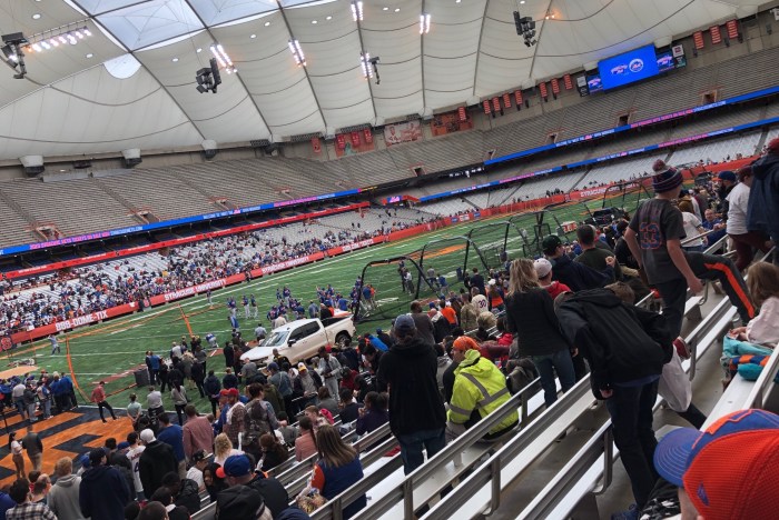 A crowd I thought to be somewhat comparable to a Syracuse University spring football game watched the players get ready for Thursday’s season-opener in D.C. against the Washington Nationals with plenty of enthusiasm. (On the way home, I heard Syracuse play-by-play announcer Matt Park estimate the number at 4,000 to 5,000 on his Orange Nation radio show.)