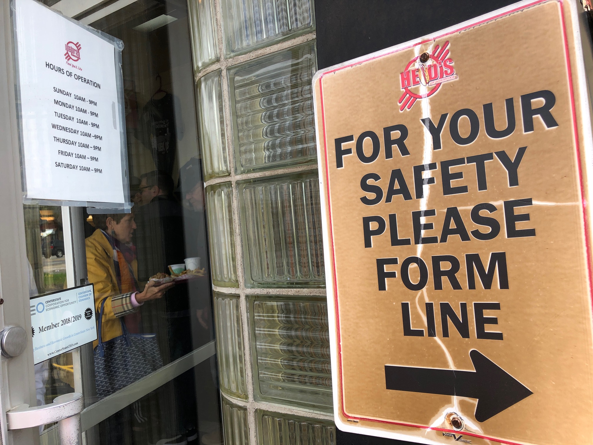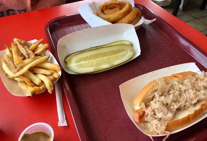 Karen snagged a table inside so we could truly savor our tray full of lunch. Two kraut franks for me. A plain frank for my dear wife. Fries, onion rings and a whole pickle to share. I top my dogs with Heid’s incredible spicy brown mustard. (For those of you asking this question at home, a coney is a more spicy, white-colored hot dog indigenous to our part of the world. Some folks pronounce it Cooney, but I go with Coney, as in the Big Apple locale Coney Island.)