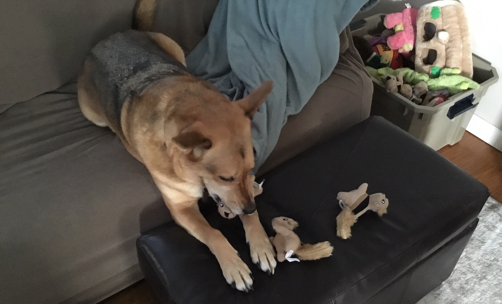 Our cherished rescue mutt Ellie B aka Dogamous Pyle needed to replenish her stock because she’s so tough on her supply of plushies.