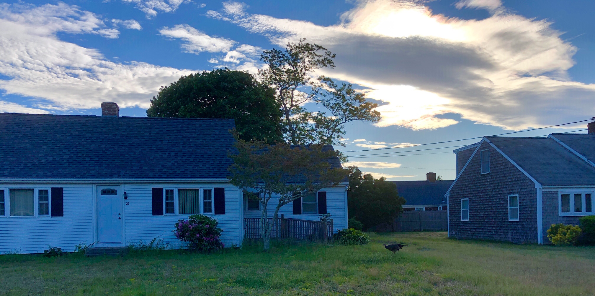 My dear wife Karen and I assumed it was wild, but perhaps it is someone’s pet. It did not seem afraid of any of the three of us, following us for several houses before disappearing to wherever turkeys go in Cape Cod.