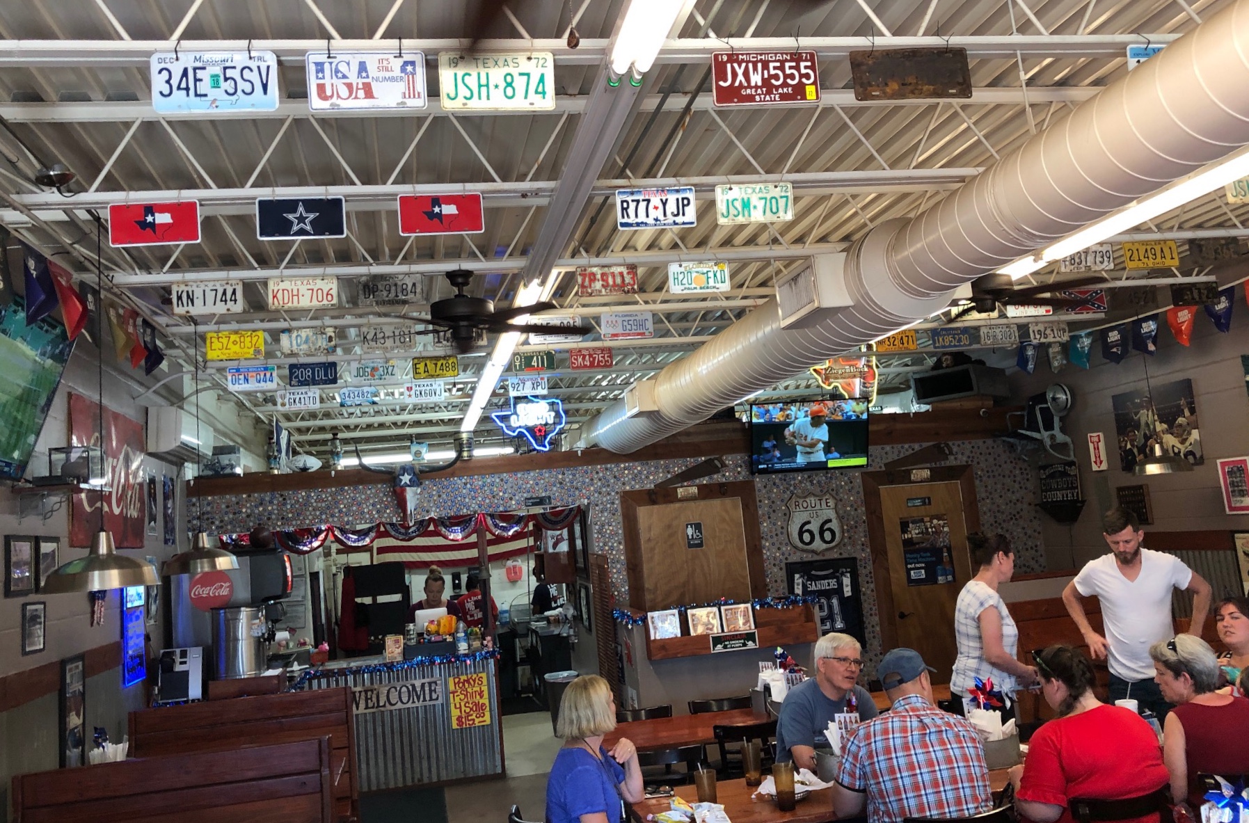Owner Porky – no, that’s not really his name! – noticed our enthusiasm (and large number) and came over to chat, asking us where we were from. Alaska. California. Arkansas. Syracuse. Ah, he said. He moved to Texas from Watertown, just a bit north of our home area. That explains the Yankee Stadium photo, George and I said to each other in a glance.