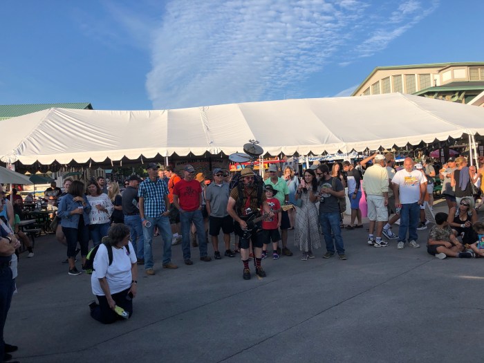 The big sound came from the guy in the center of the knot of fair-goers on the midway.