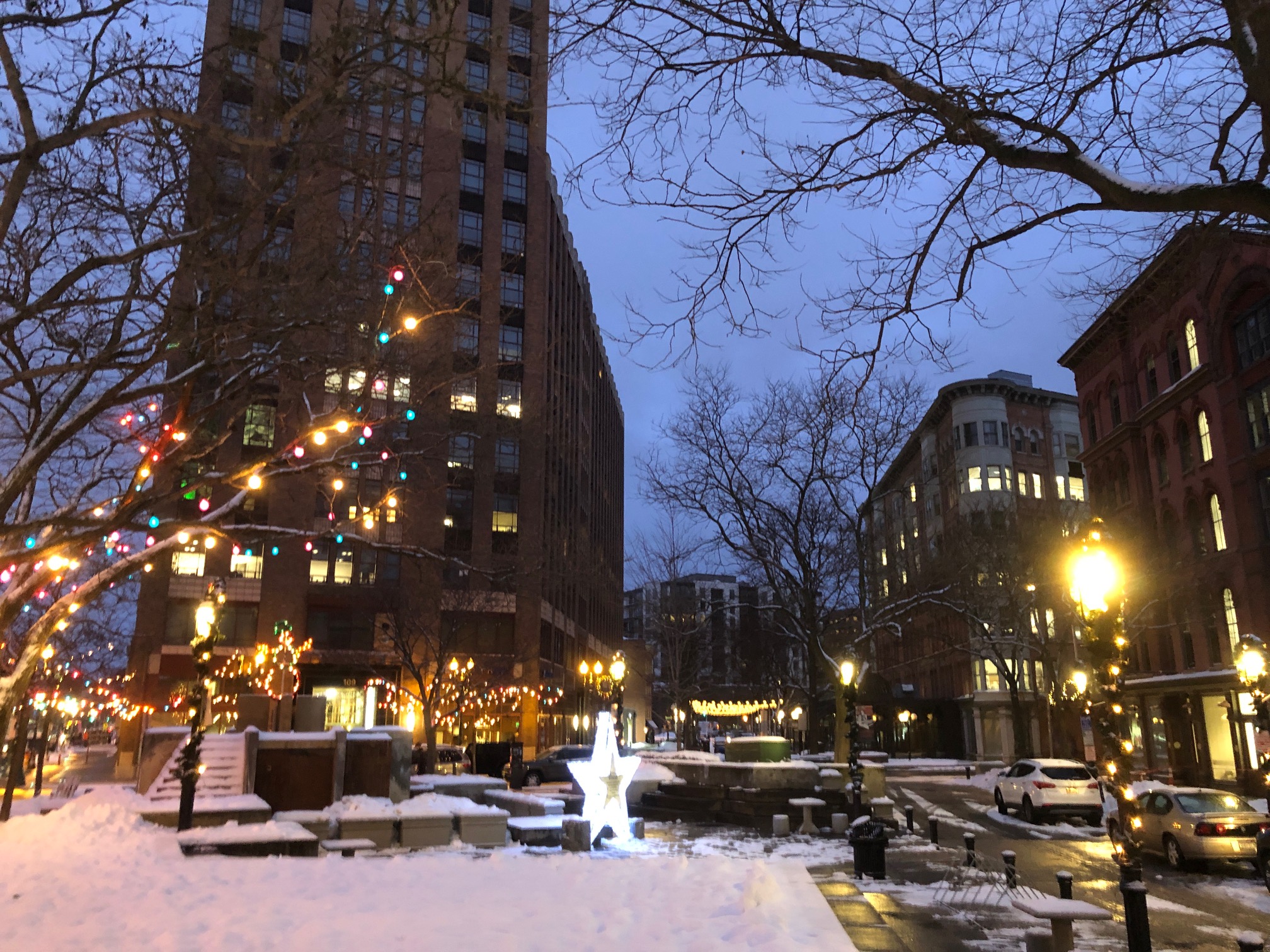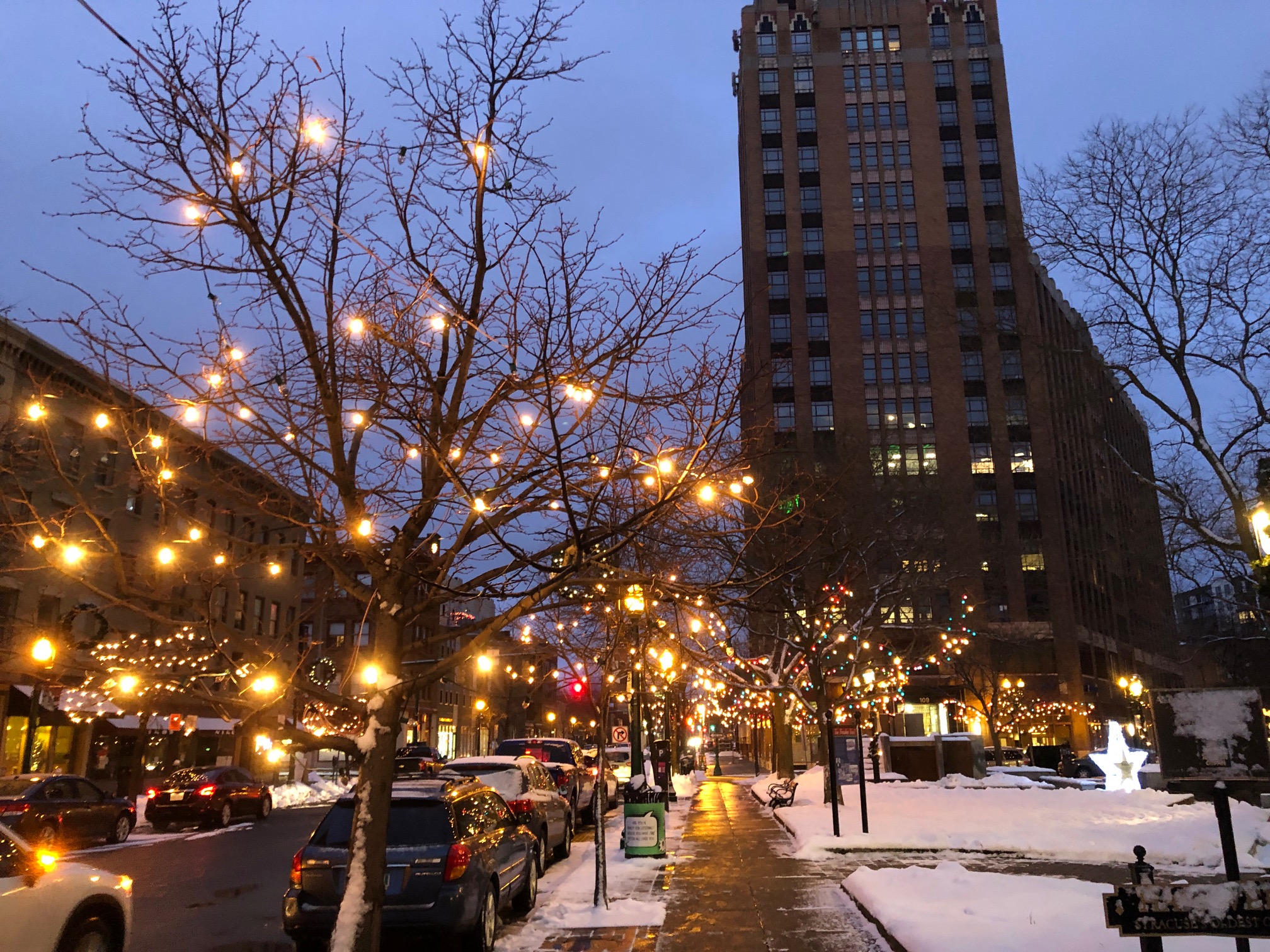 Downtown Syracuse’s Hanover Square warms my heart still with its decorated skinny stick trees.
