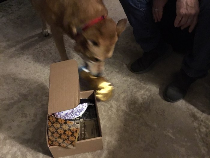 2. Puppy Cody loves boxes, too. We often put a treat inside an empty cereal box and let her tear it apart. Most fun ever! Ellie B deserves her gift – I’m sure she wears herself guarding you and Karen every day. [Virtual] hugs to all of you.
