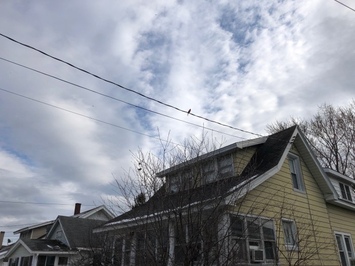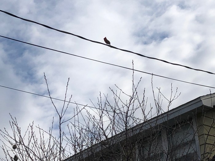 The day after spying a pretty female cardinal in a tree, my dear wife Karen and I spot, one block over, a male cardinal on a wire.