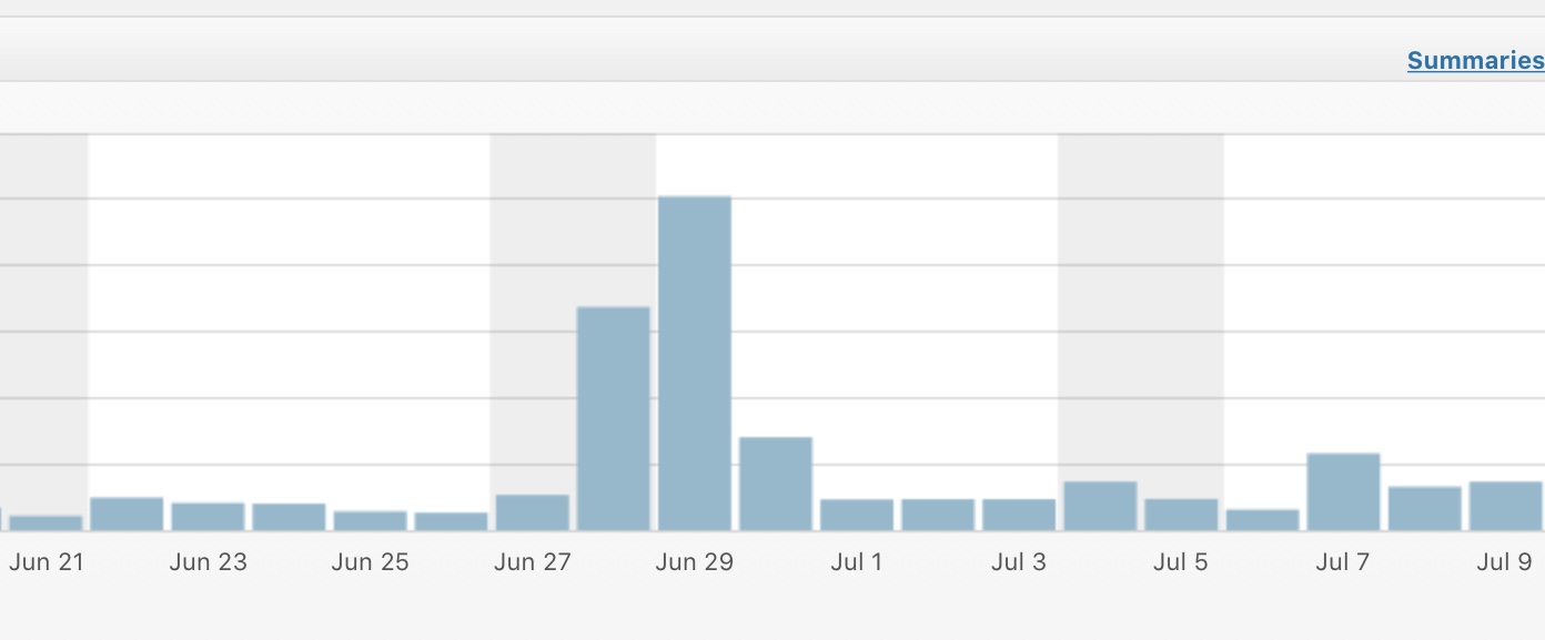 Lots of Jits are going to my home page. And then they are spreading out to many, many posts. Old posts. Multiple hits. Day by day. Sometimes the same amount on each post. No comments left.