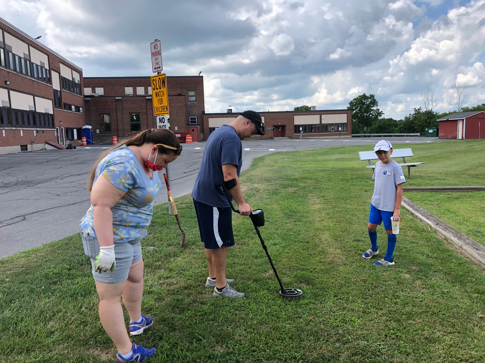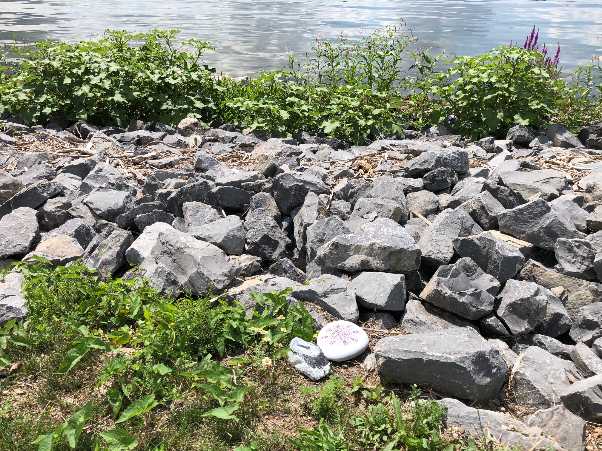 A quarter was unearthed at Onondaga Lake Park. Equally interesting was the painted rock discovered at the shoreline (left). Elisabeth picked it up and replaced it with her creation (right). She’s into it.