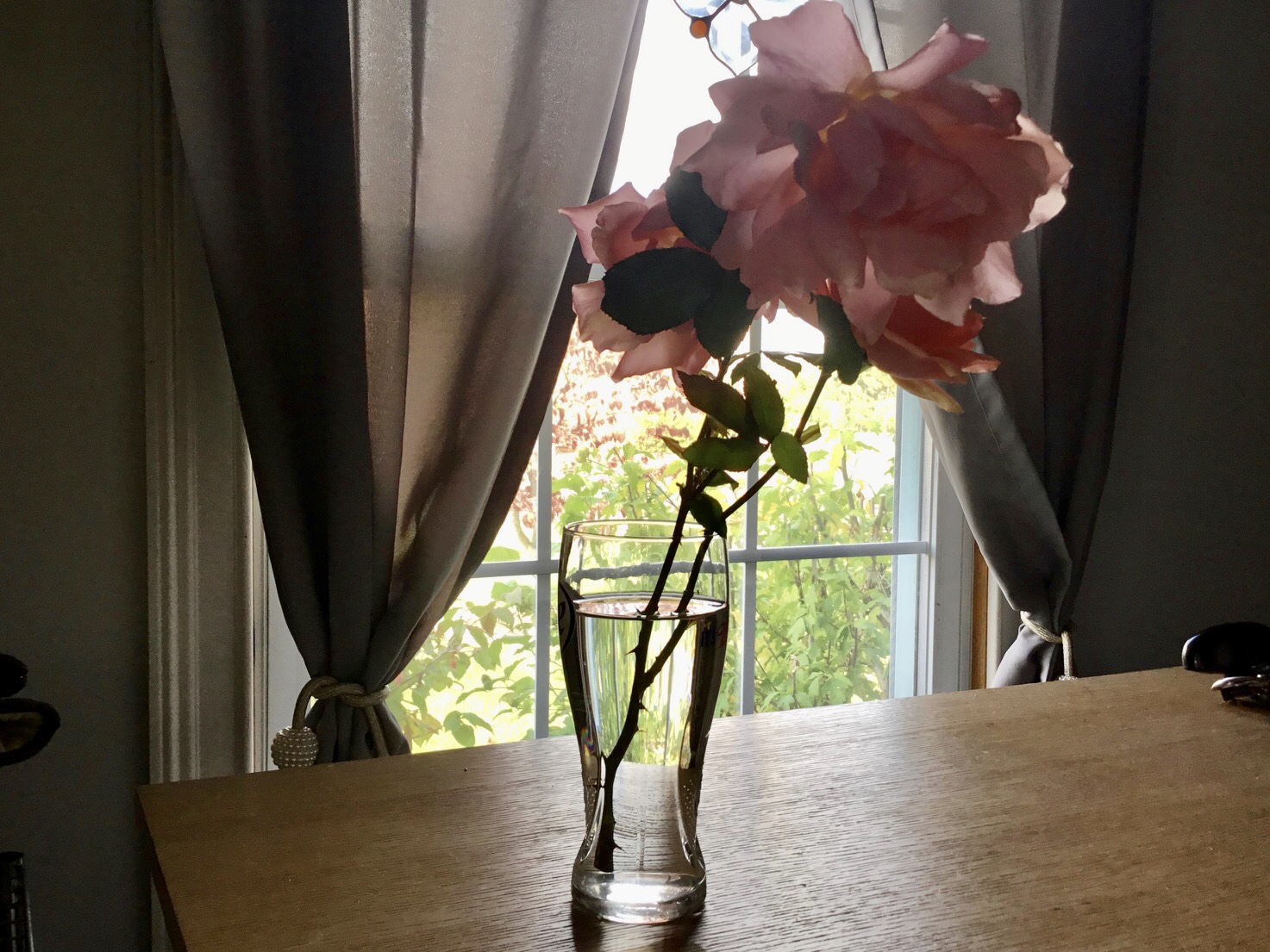 My dear wife Karen brings the pink inside for a final kitchen table showing.