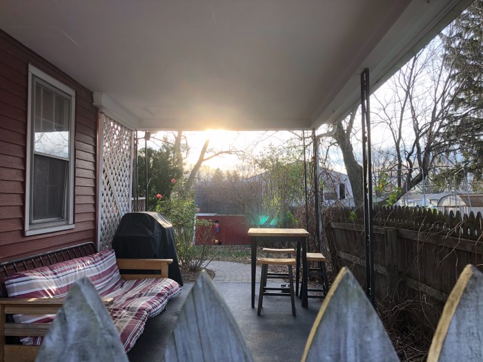 No, I leave early enough to get there with time to spare. I was able to take my iPhone 8 out of my pocket and take a photo of the rising sun just-so between the backyard trees and the side alcove before I get into my car.