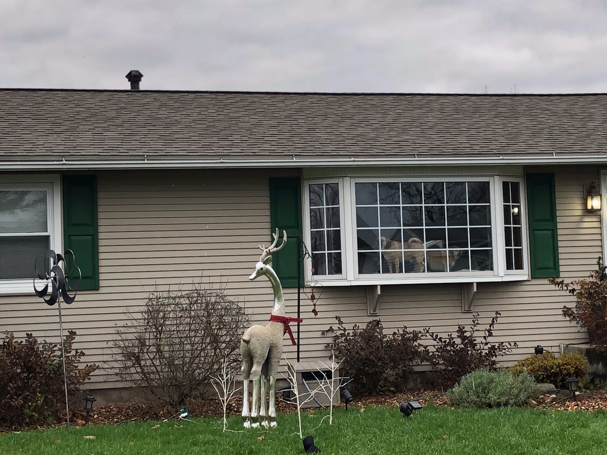 On a safe walk around our neighborhood blocks, cherished rescue mutt Ellie B aka Dogamous Pyle and I came upon our first Christmas reindeer of the season.