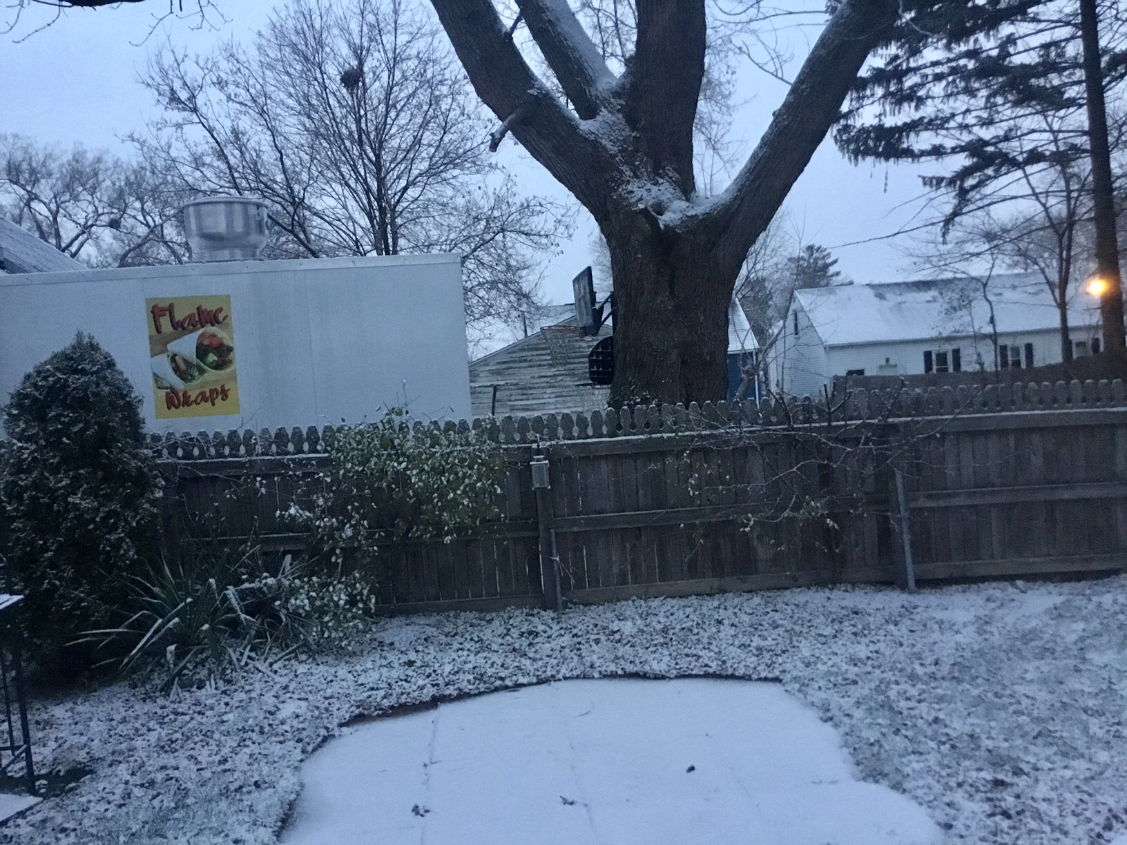 Next to the big tree is now … yes … that is a food truck, we believe, parked snugly in the backyard.