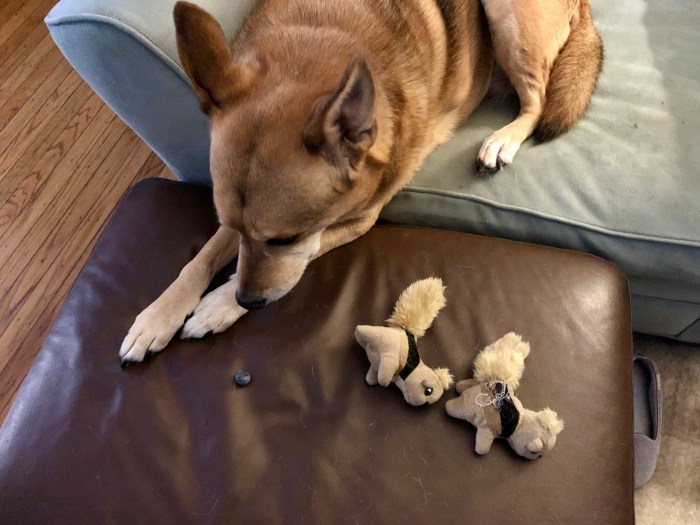 We had that toy for our dogs! Did you get the tree stump, too? It was great fun watching our Morgan, the mixed border collie, and later Cody, the Golden/Shepherd mix, get those squirrels out of the tree – until they each destroyed the squirrels, of course. However, our “aggressive” guard dog, Riggsie the purebred German Shepherd, would get the squirrels out and then merely cuddle them. Go figure.