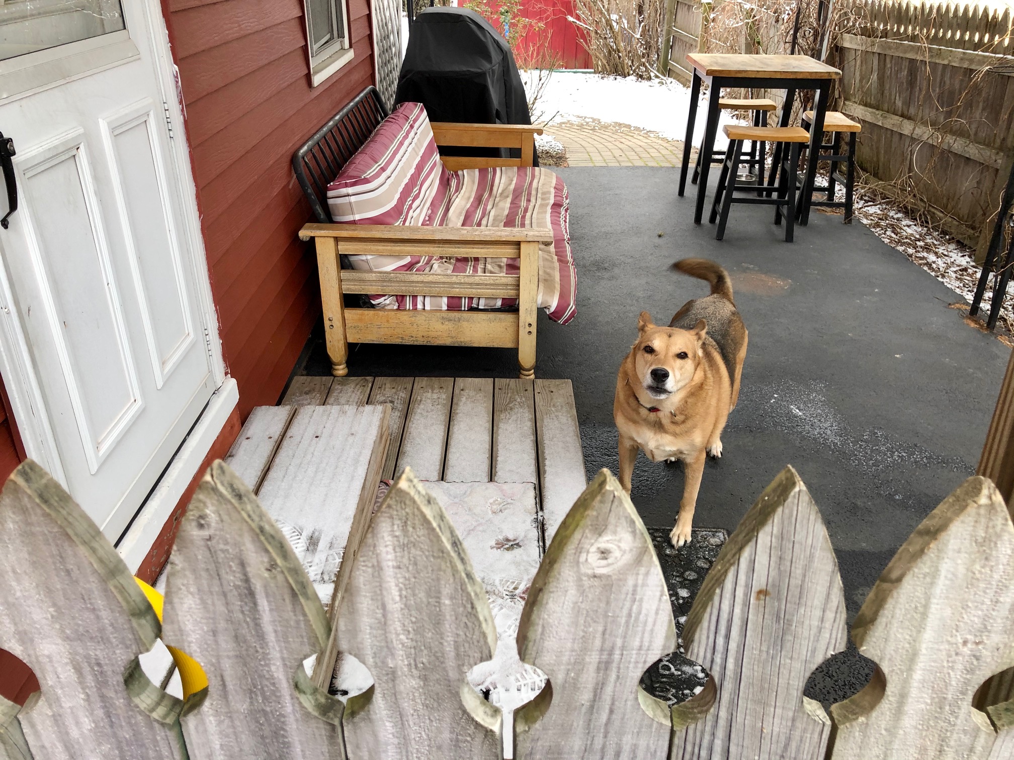 Here’s what happens if I let the dog out and take the garbage pails in at the same time.