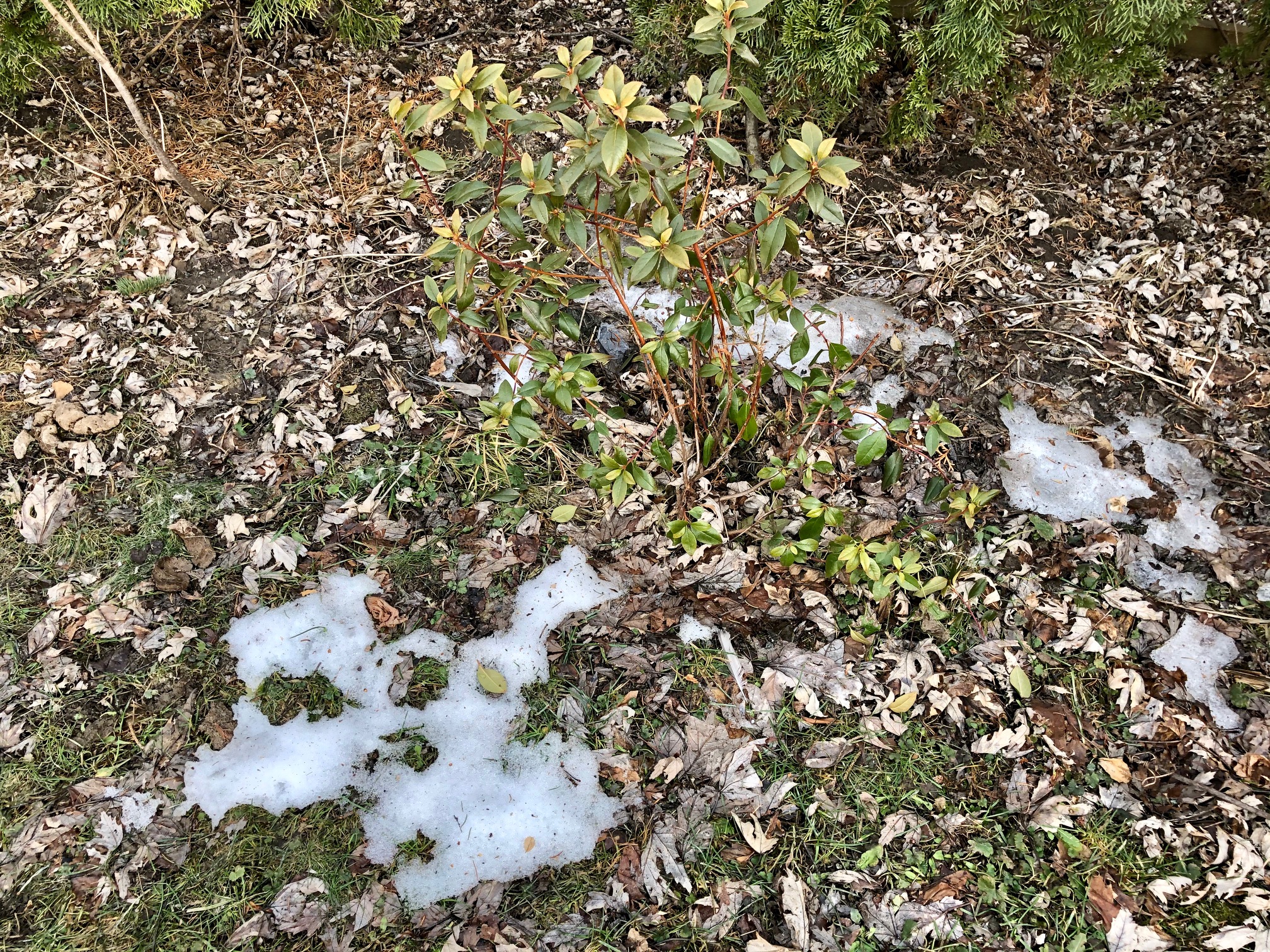 The mid-March green is rising in our backyard, too. Still some lingering snow, you see.