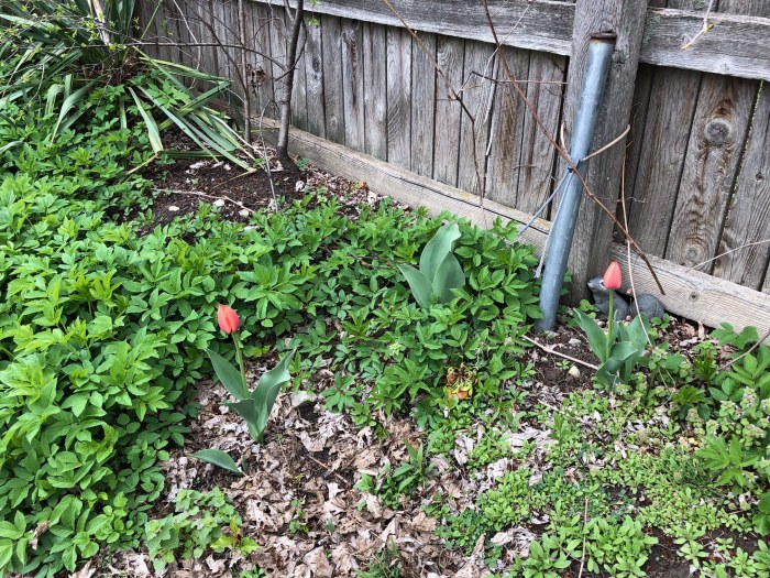 Watching cherished rescue mutt Ellie B do her thing after my work shift at the library, I note in the backyard two popping tulips.