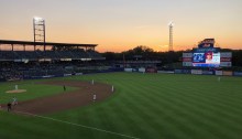 KP and I had to stretch our legs for a bit during the Syracuse Mets-Scranton/Wilkes-Barre RailRiders game Thursday night at NBT Bank Stadium. The sun setting over the left field wall sure was pretty as we wound our way toward right field. And the outfielders sure looked alert as we bellied up to the rail…