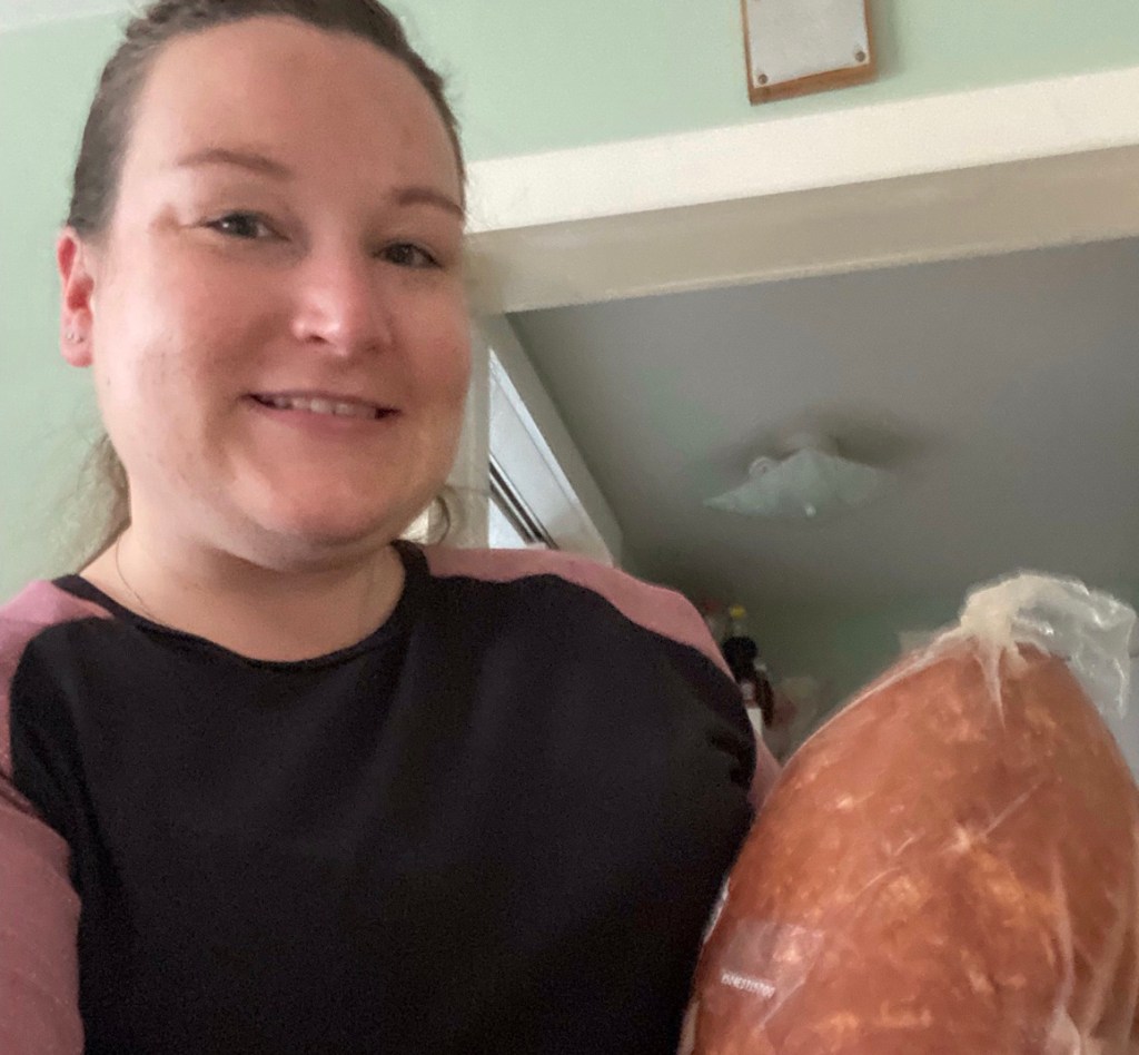 Yes, Elisabeth won a really big ham. She says 15 pounds. I looked at her texted photo and guessed heavier. It came with a jar of mustard and bell peppers.