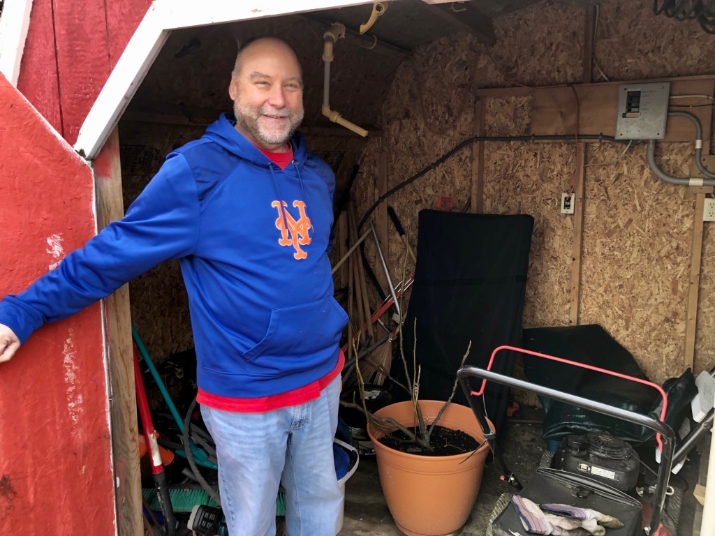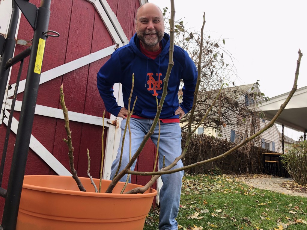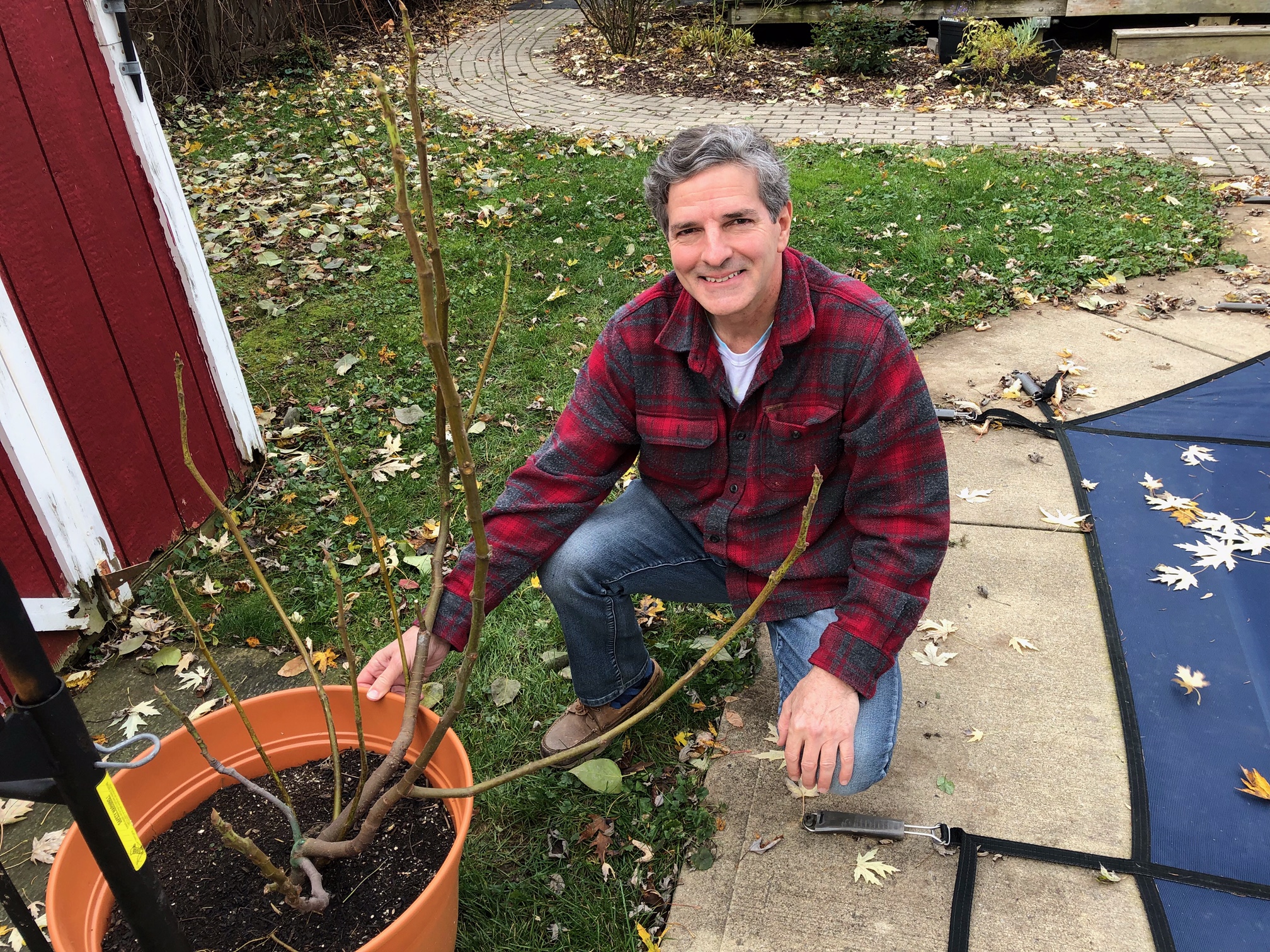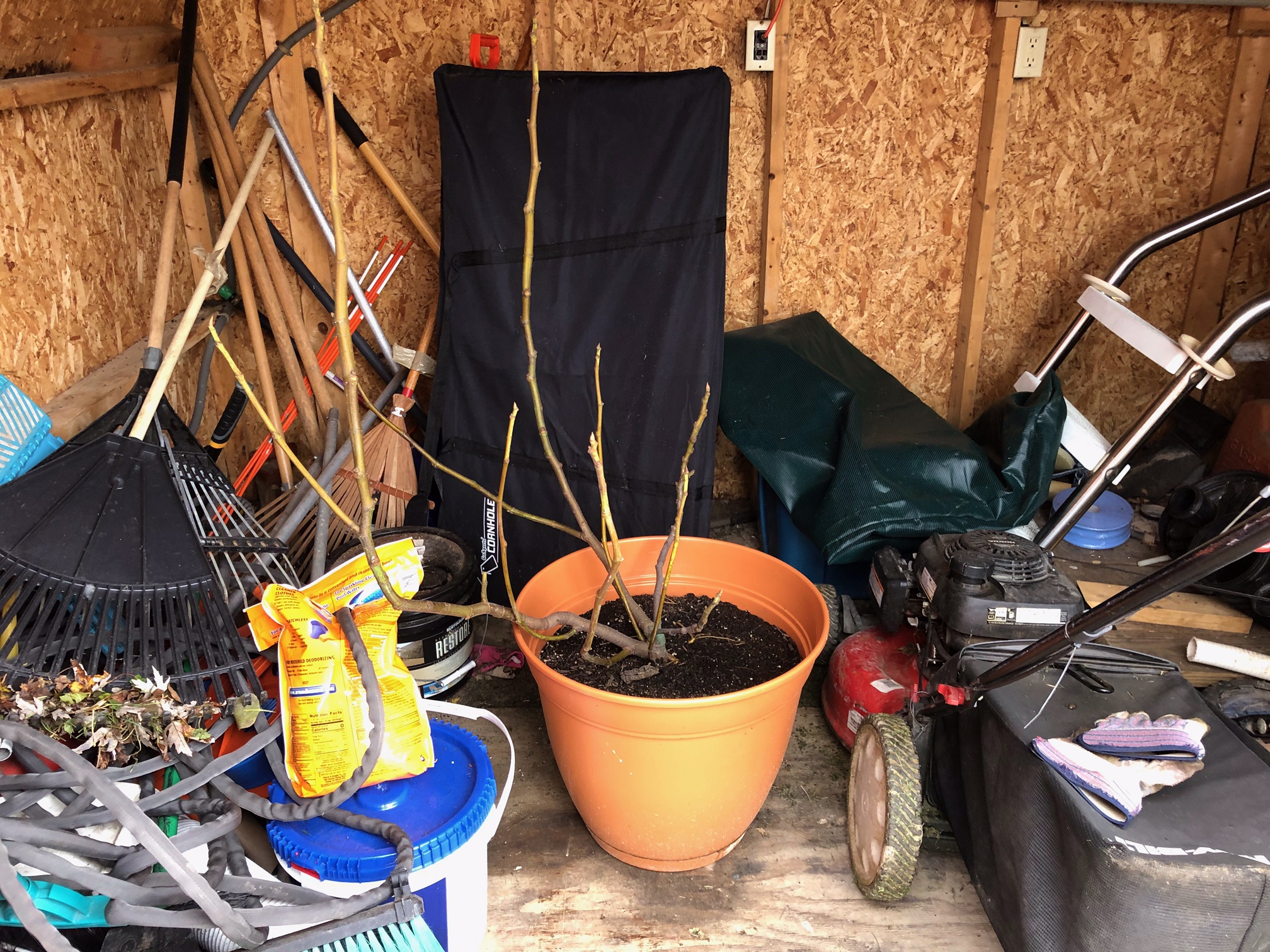 The first step is to keep it out of the winter’s harshest wrath of snow and wind, snug among our tools and equipment in the shed. We’ll water it once a month, John instructs.