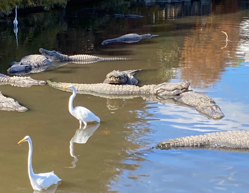 My terrific daughter Elisabeth texted from Florida this example of gators and long-necked birds not caring that park people threw them together and charged admission so regular folk could admire how they got along.