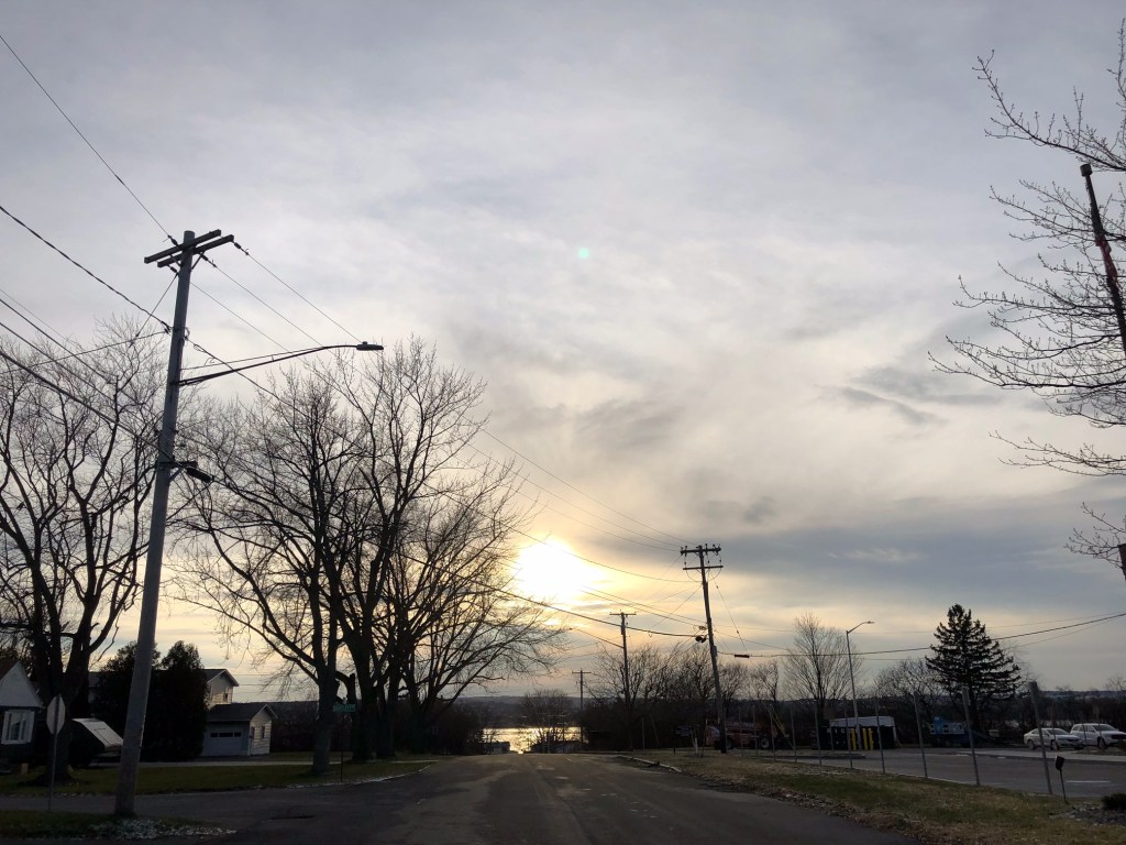 Walking around the front lawn as afternoon threatened to give way to evening on a day off from the library Thursday, I noticed the sun hanging right over our lake view slice down the road.
