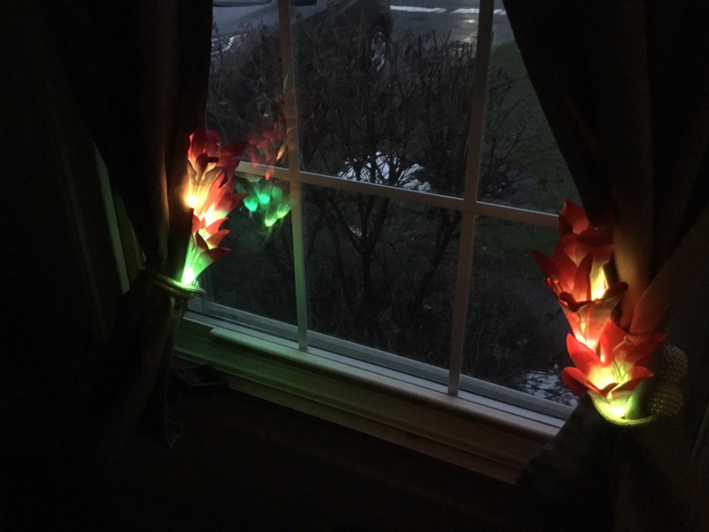 This gift of solar-powered flower lights will look delightful among the blooms of spring and summer, we are certain after Karen hung them for the rest of winter at the flanks of our kitchen window.