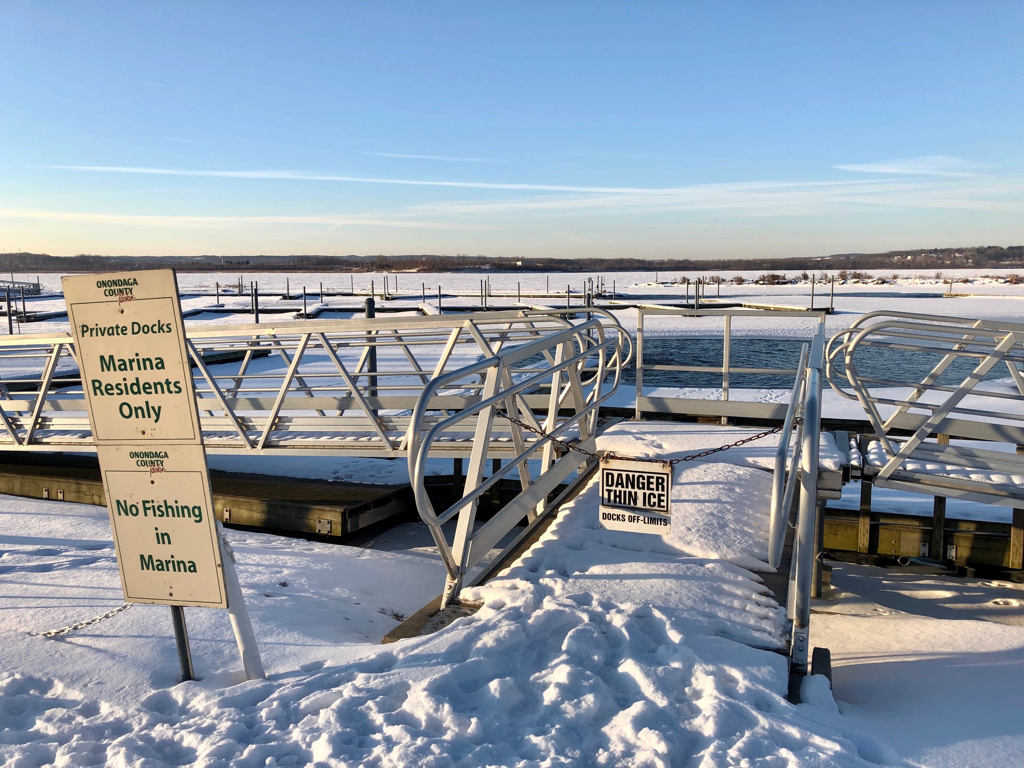 My cold stroll managed to cross lots of snow to the edge of the Onondaga Lake Marina, where the warning signs were true.