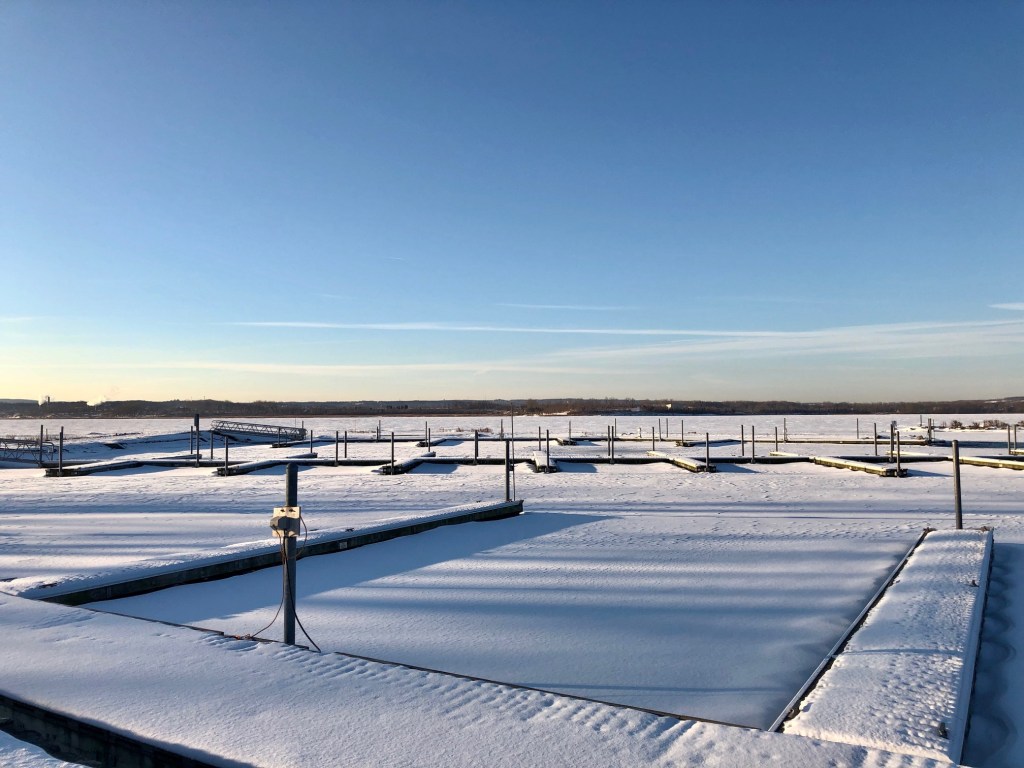 The iced-over boat berths at our Onondaga Lake Marina seem lined up in perfect winter symmetry.