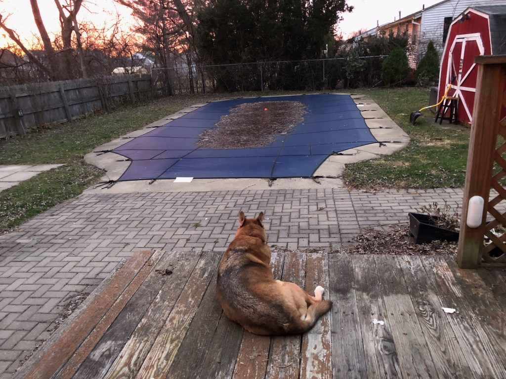 It’s an orange ball thrown over the fence by the neighbor kids, ladysighs. I’m not venturing to the middle of the cover to get it, but I may get our longest rake and sweep it out of there and chuck it back over. In due time. Good eye!