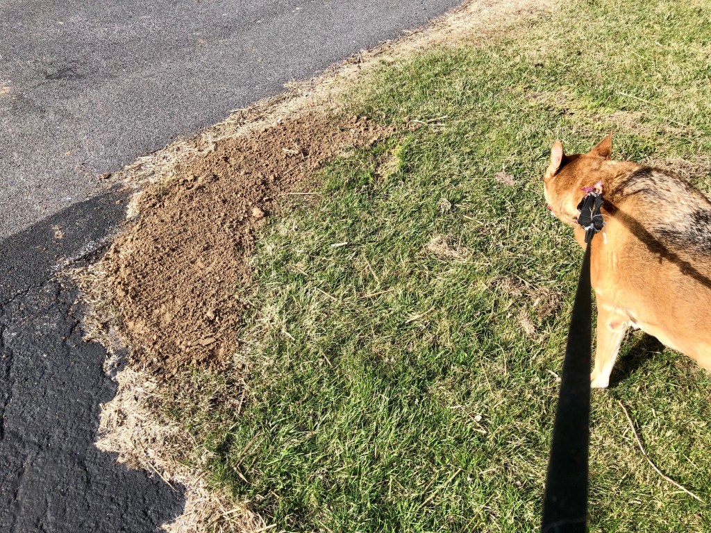 I arrived home from my work shift at the library to find the driveway stakes gone and the plowed-up edge at the street corner turned over and seeded.