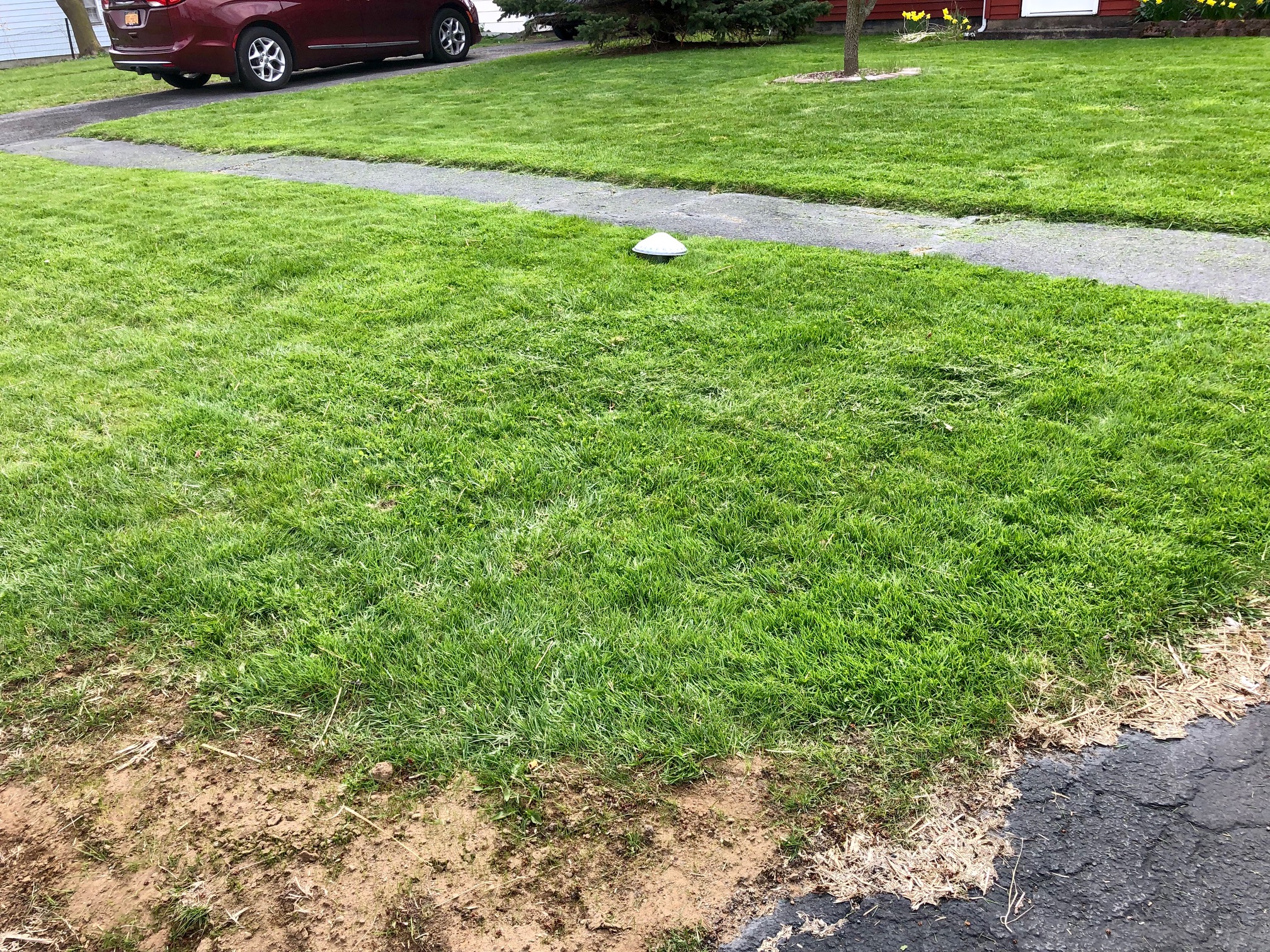 It’s our interpretation of the sewer line pipe cap they put on everybody’s lawn around here, ladysighs. The original issue caps all seem to weather off and then homeowners are left to find a way to make sure the hole isn’t left open. We went with the alien-appearing vent-duct cover found in the local hardware store that fits quite nicely.