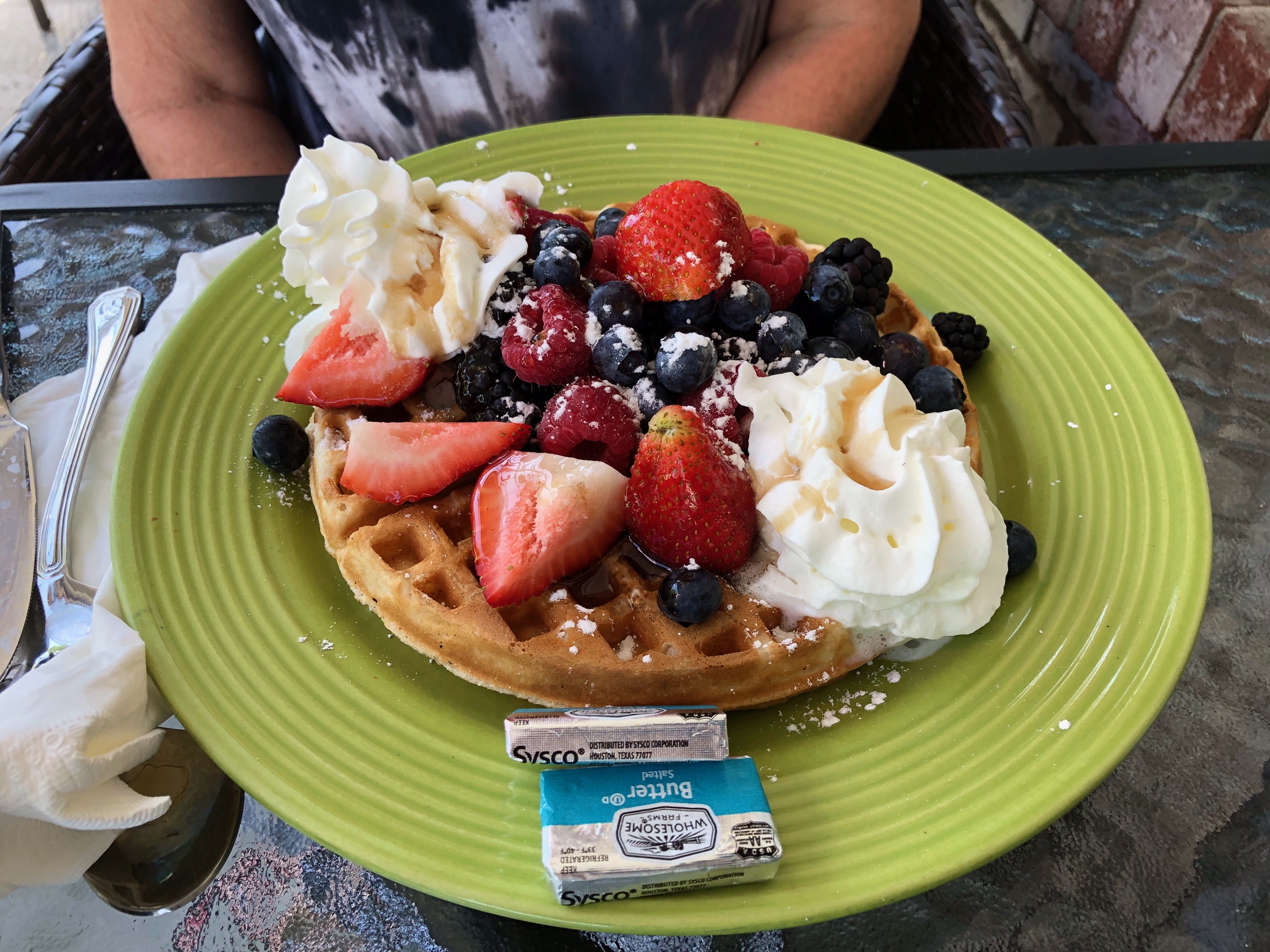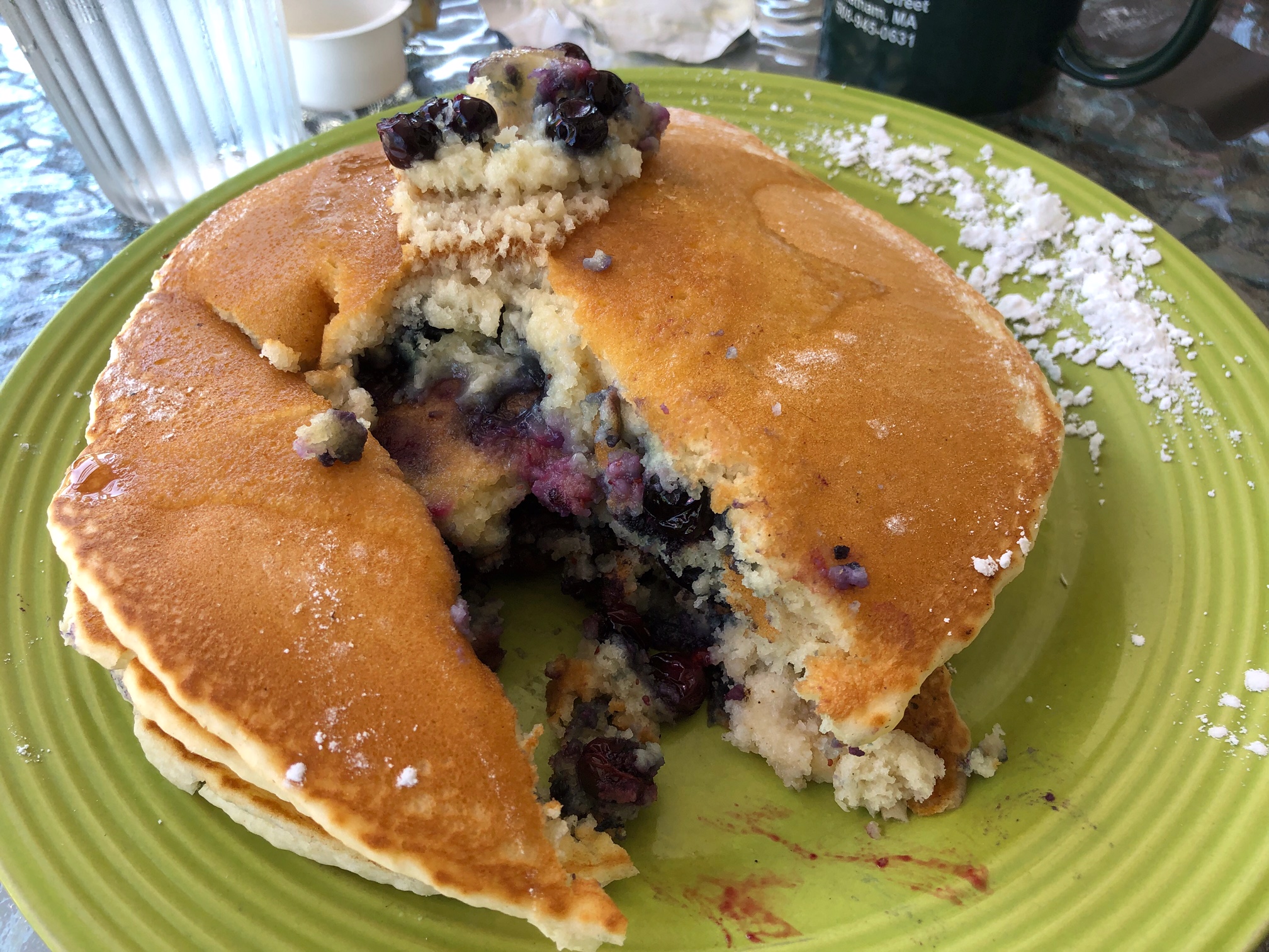 I quite surprisingly went for a nice stack of blueberry pancakes after hearing from out waitress that , yes, they did have sugar free syrup, and no, they would not come with a sweet, goey compote on top.