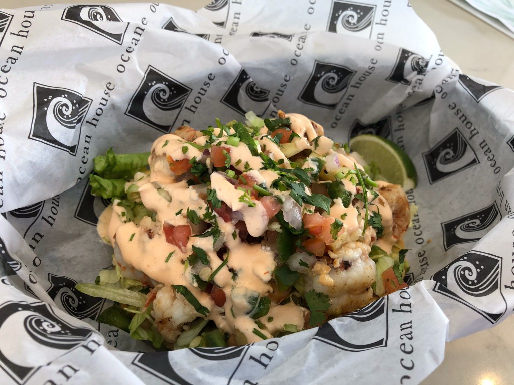So I ordered the king-sized hot lobster roll. Karen went with marinated lime shrimp tostados.