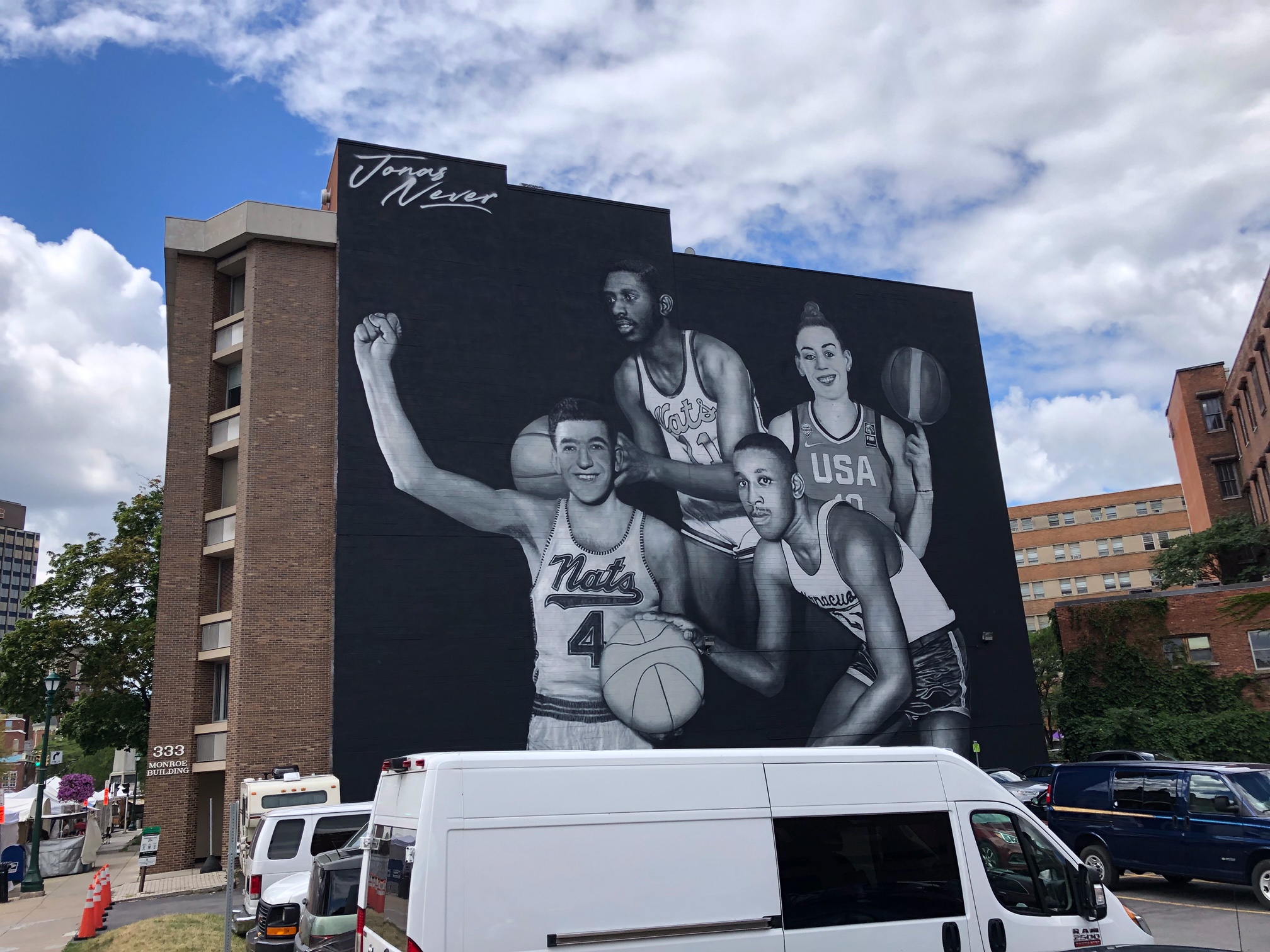 That’s the way to span a city’s rich basketball history. Great six-story work, artist Jonas Never.