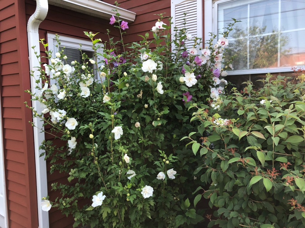 Somehow, for some reason, more purple/pink blossoms keep turning up in our mostly-white front yard window guardian.