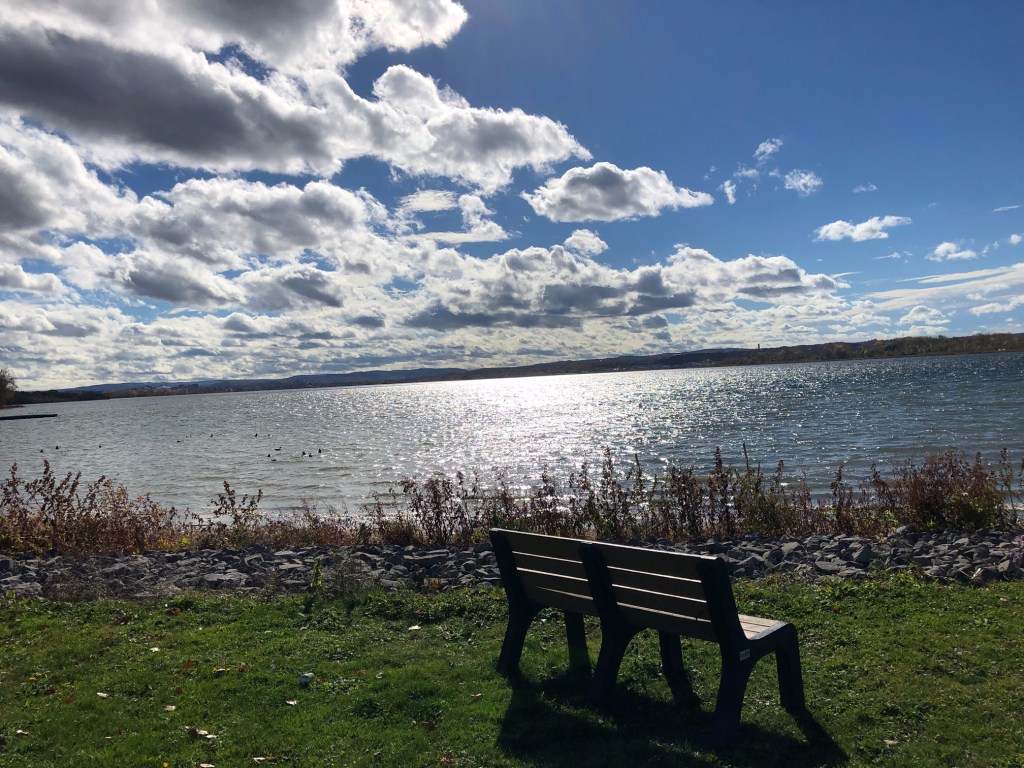 The high weeds at shore. The sun off the lake. The gray-white-cotton clouds.