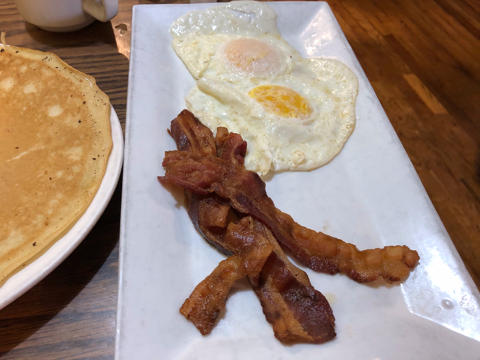 My pancakes, eggs over easy and bacon filled me up way before I’d finished he ‘cakes. In fact, a third of the two pancakes were left behind.