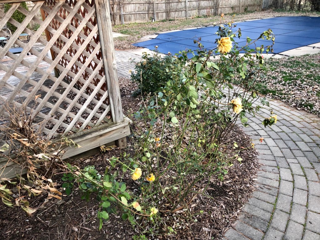 From this angle in the golden hour, the yellow backyard roses still show a little life.