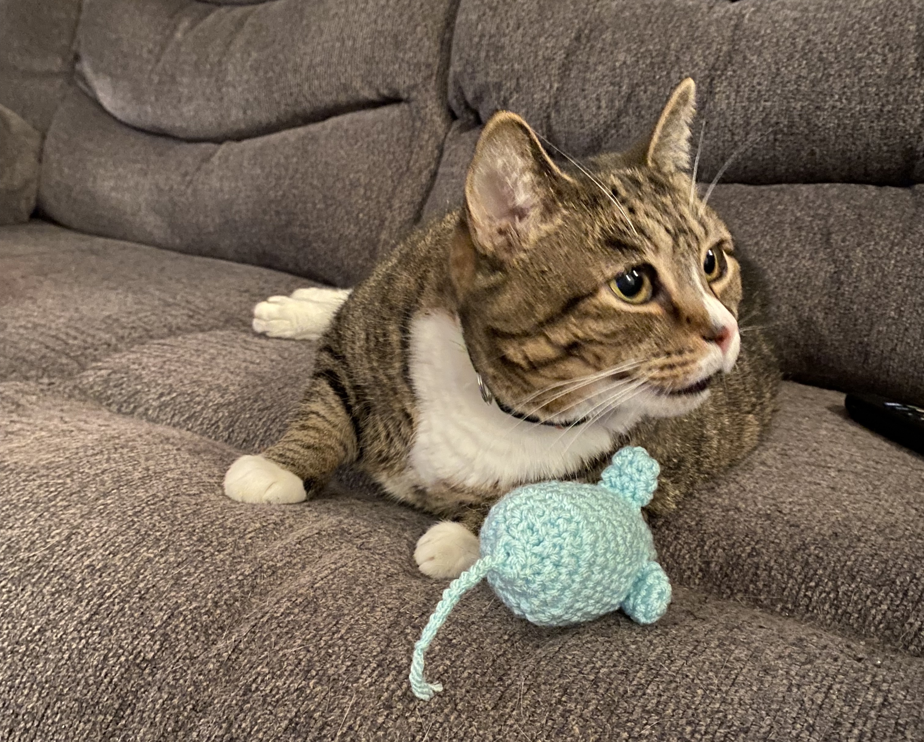 Grand cat Ava now has a toy made by Elisabeth’s cool Amigurumi.