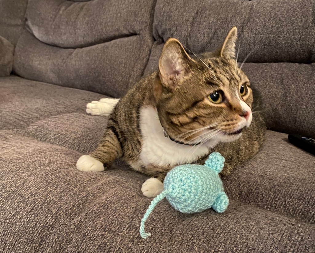 Knitty for kitty….lol. Cute toy for a cute kitty!