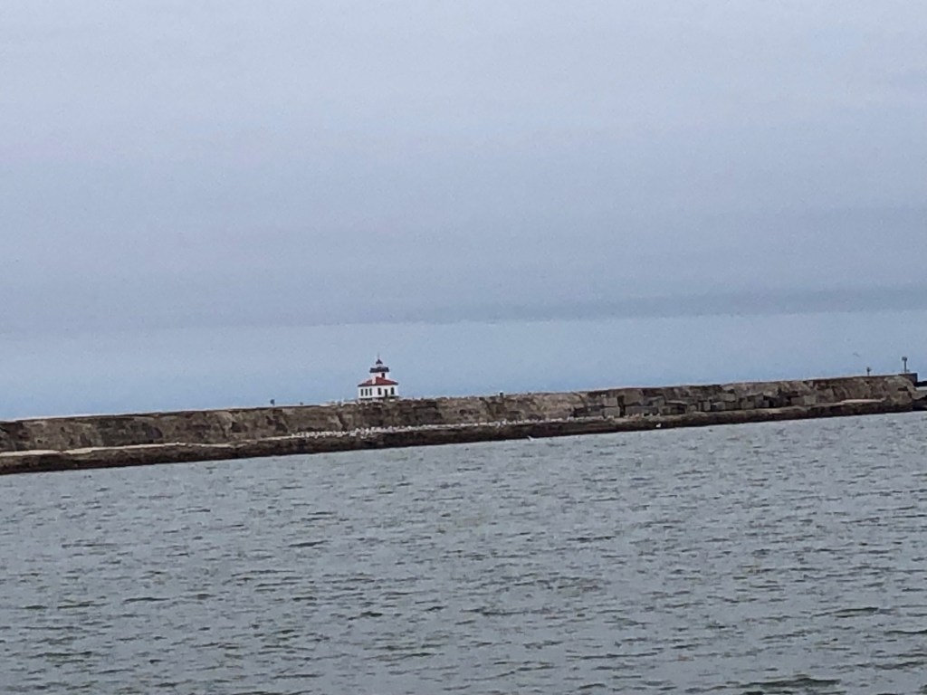 George pulled into Oswego’s refurbished harbor, and left me to squirm my way past the fence to get an unencumbered view toward the lighthouse down yonder.