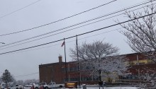 Feeling the clock change. The radiance of the central sign and the line of the trucks across the road caught my eye through the snow as I stood at the tip of my front door during this week’s late winter snow.