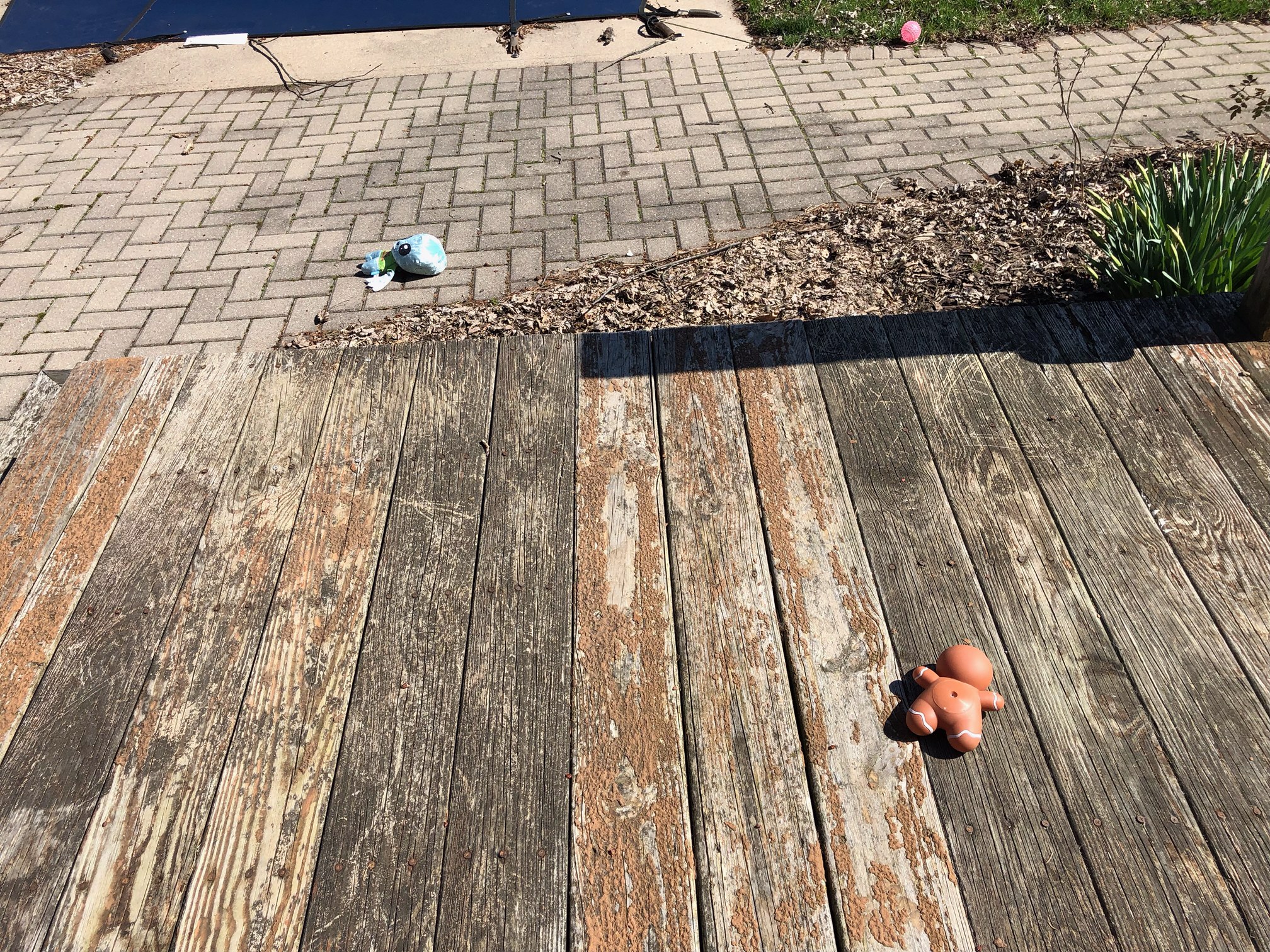 One by one, our cherished rescue mutt Ellie carries her toys from the living room storage box to the backyard deck and then beyond as the spring days get warmer and warmer.
